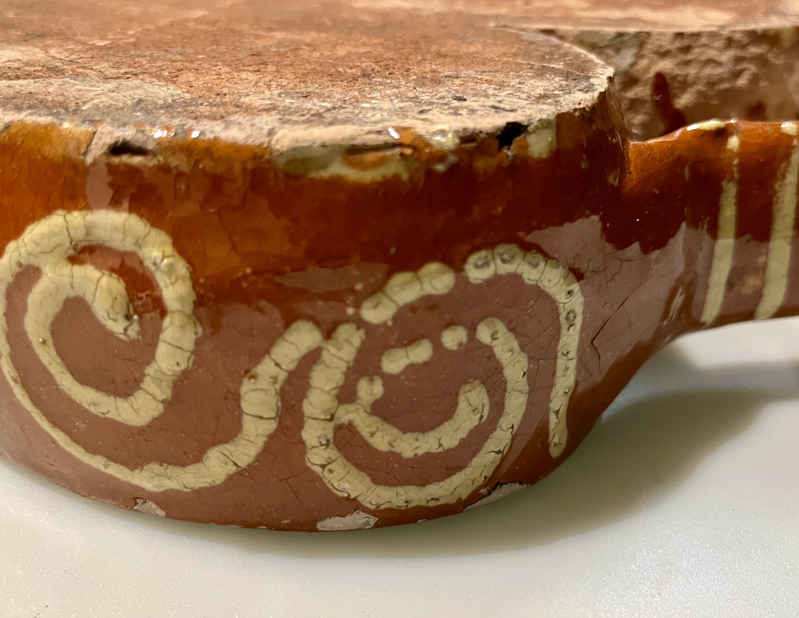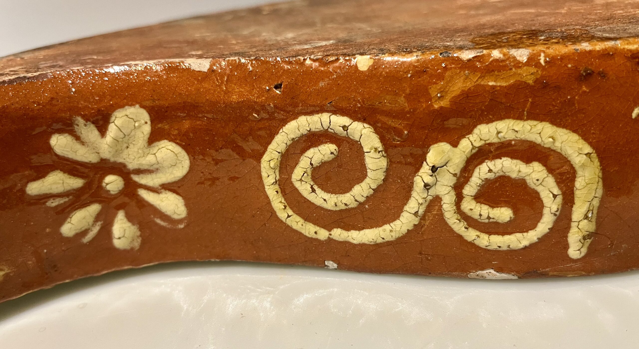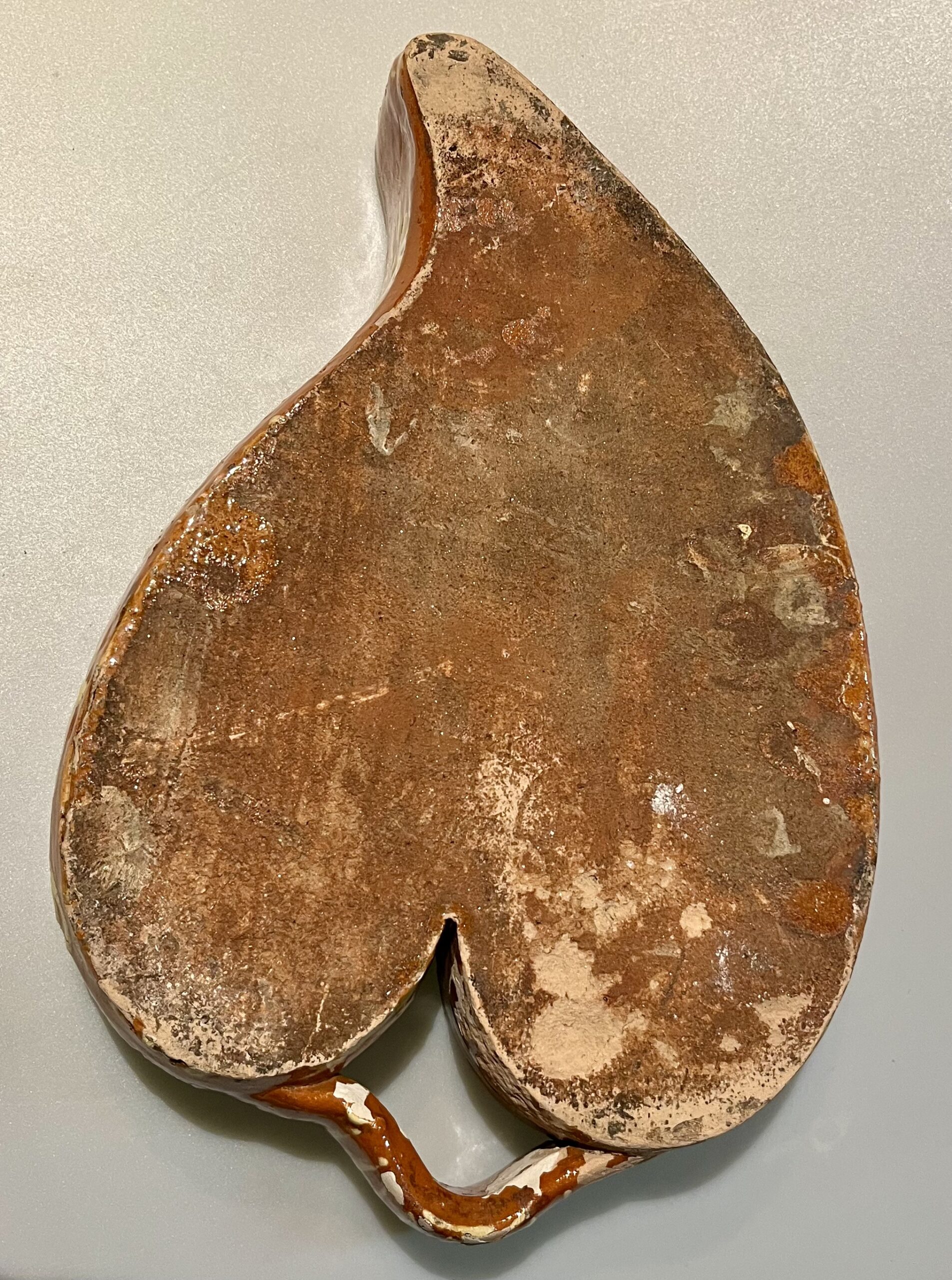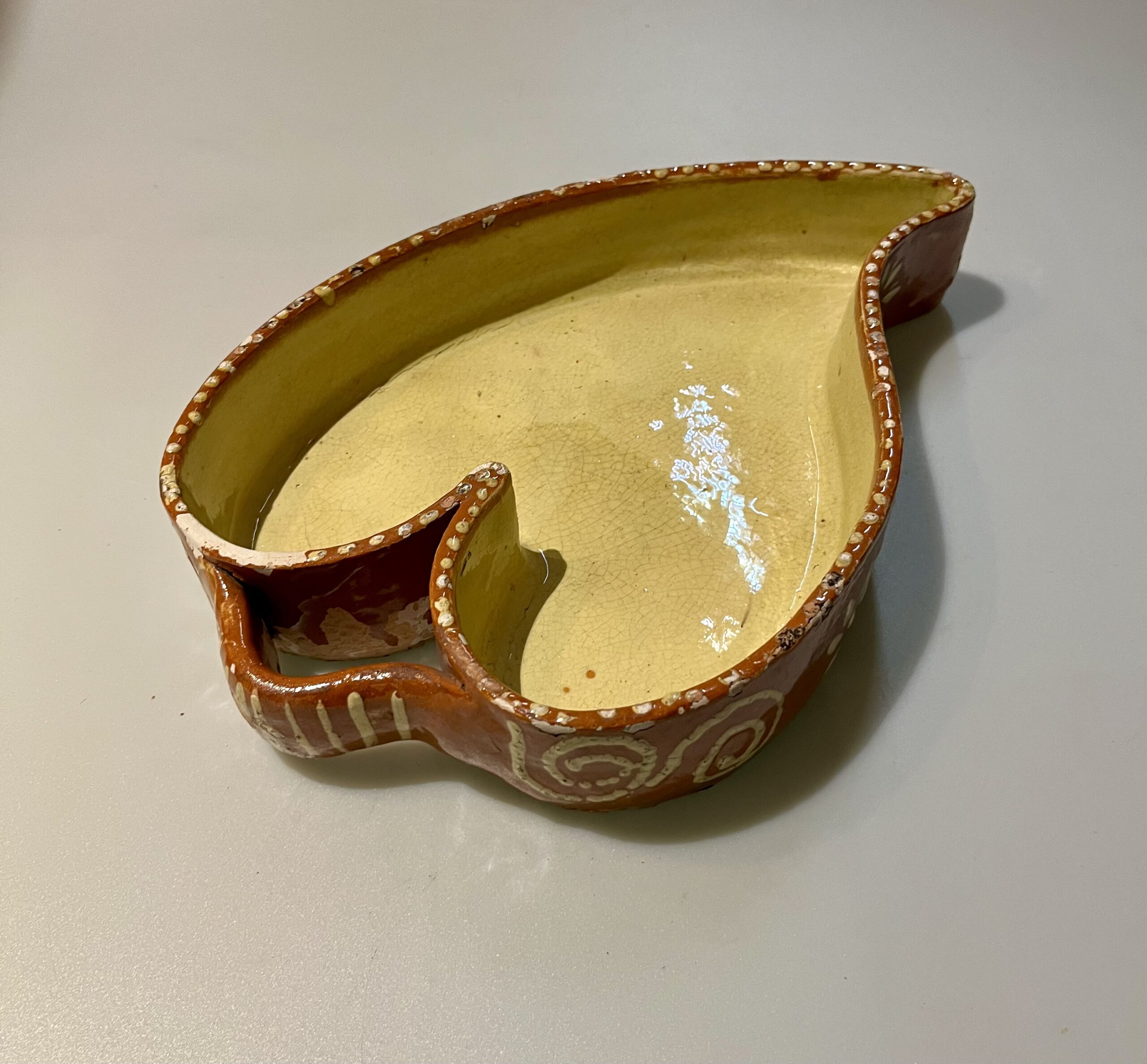 Assadeira de barro vidrado antigo do Minho em forma de coração, decorada com espirais e flores