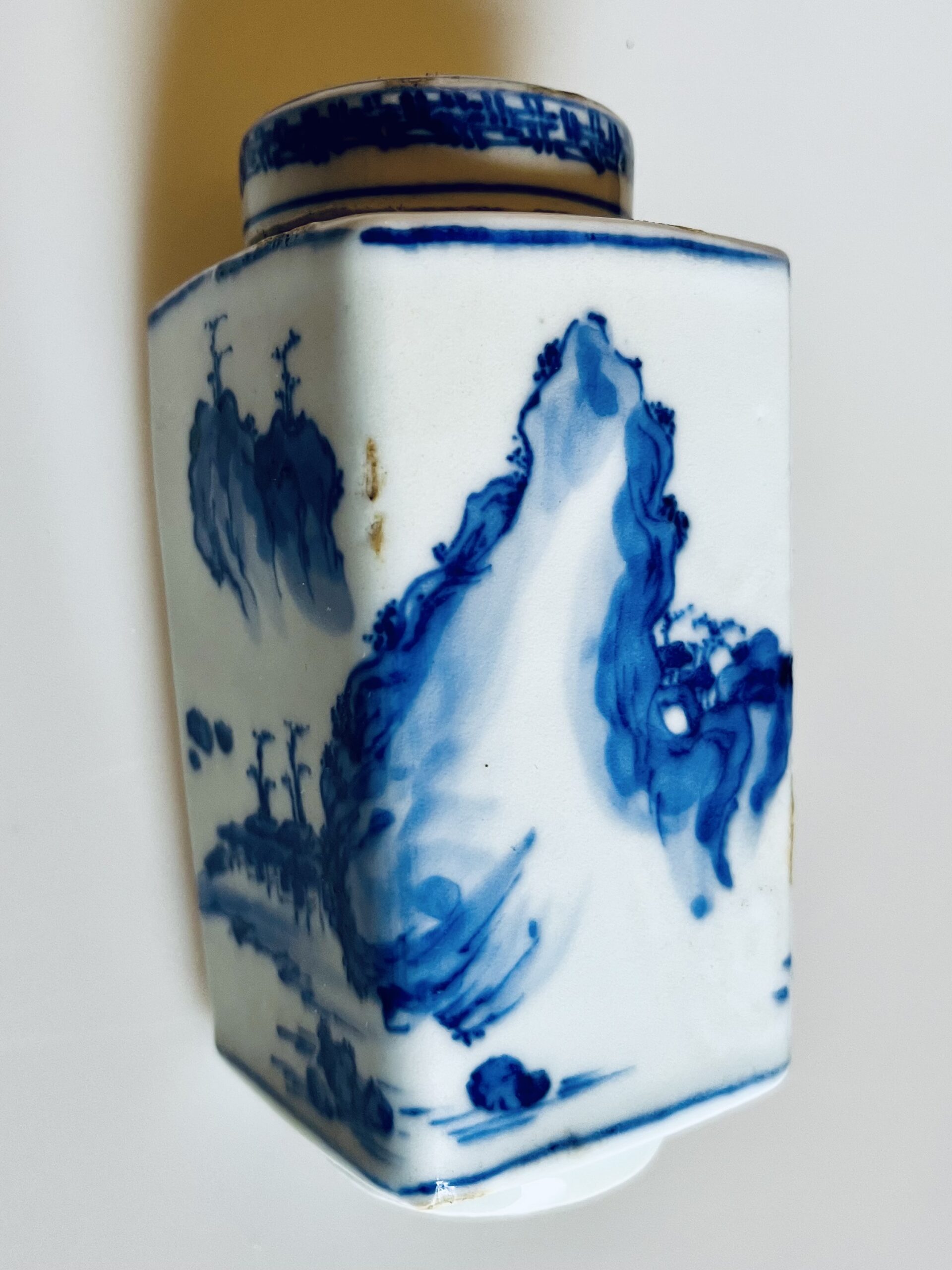 Frasco de chá com tampa em porcelana chinesa, decorado com paisagens e montanhas a azul e branco