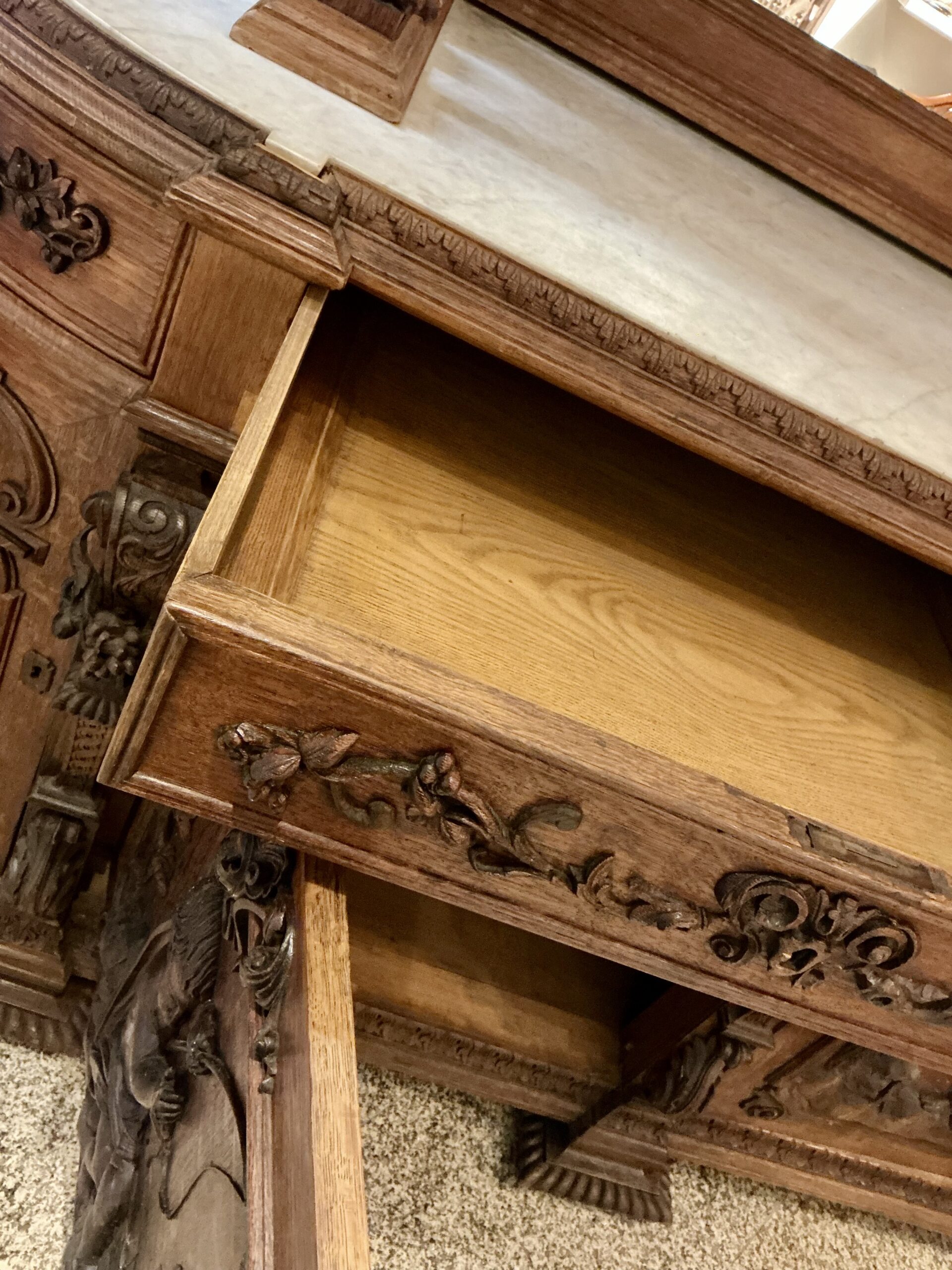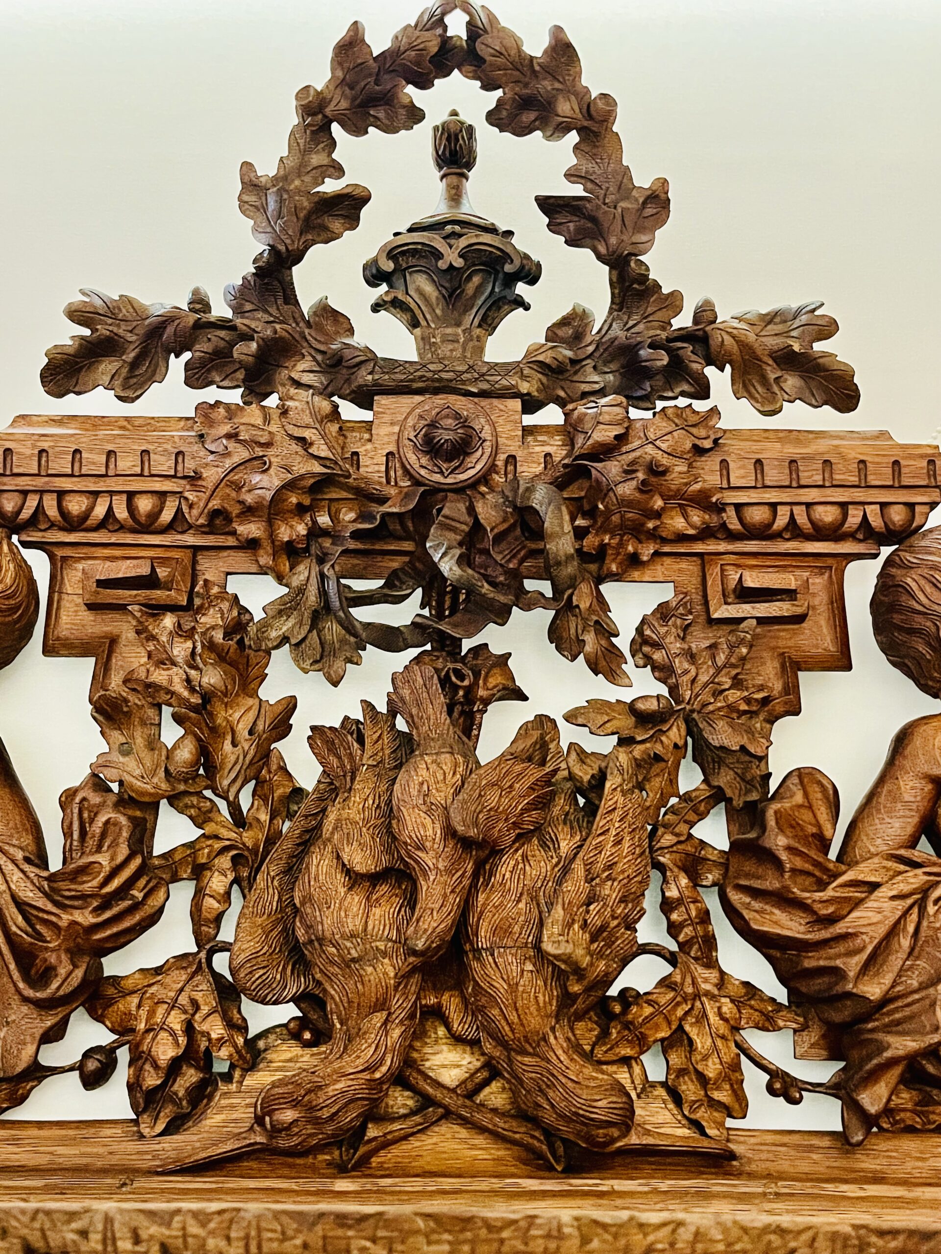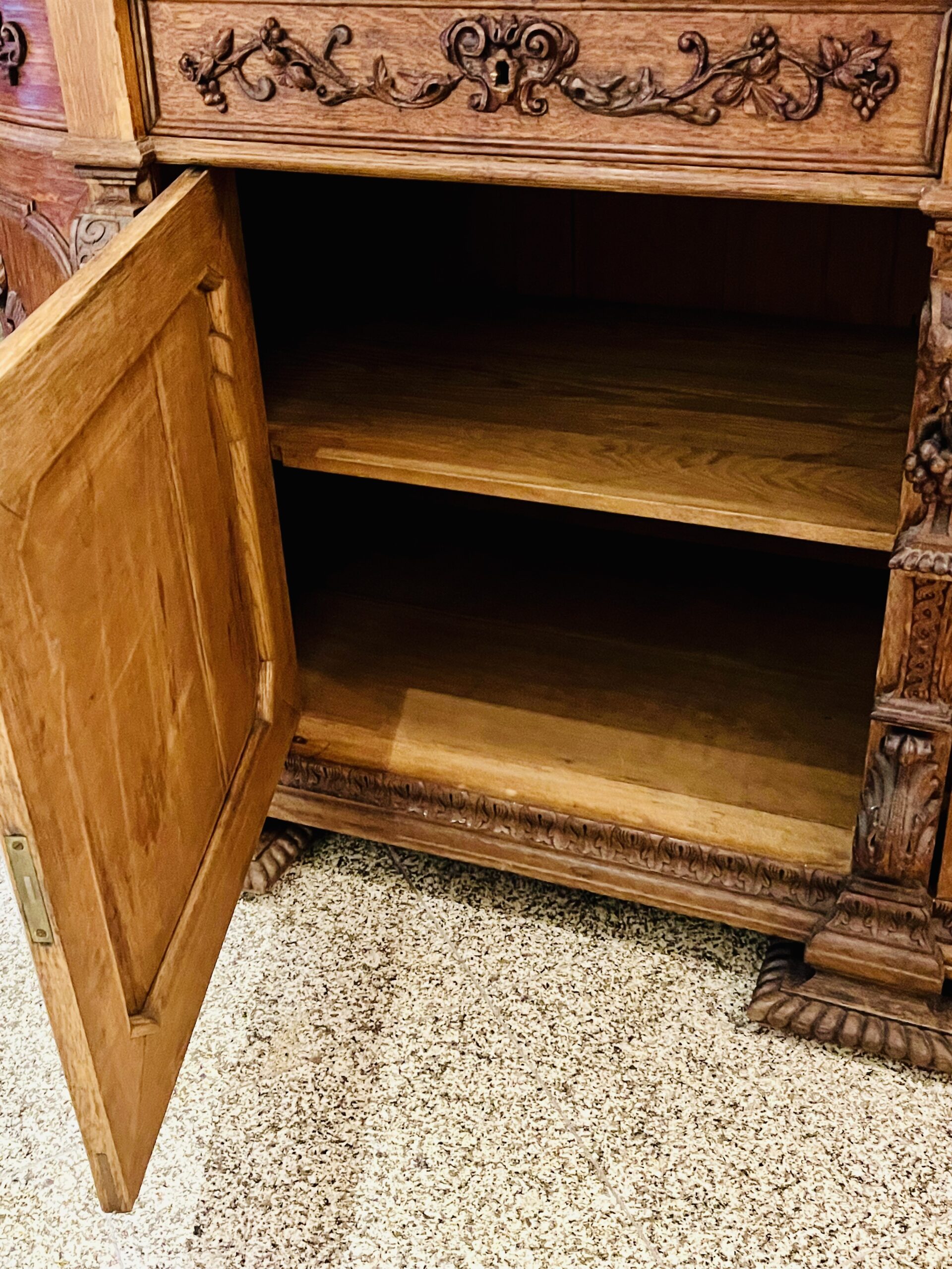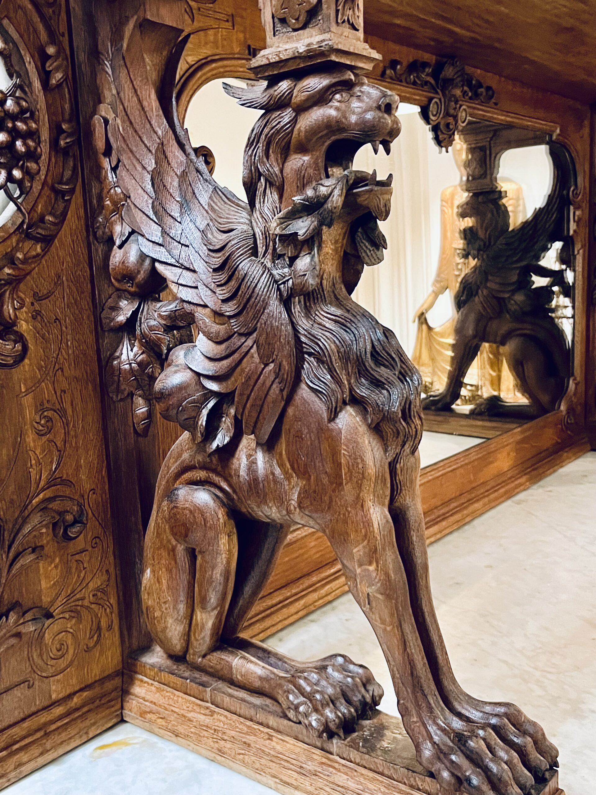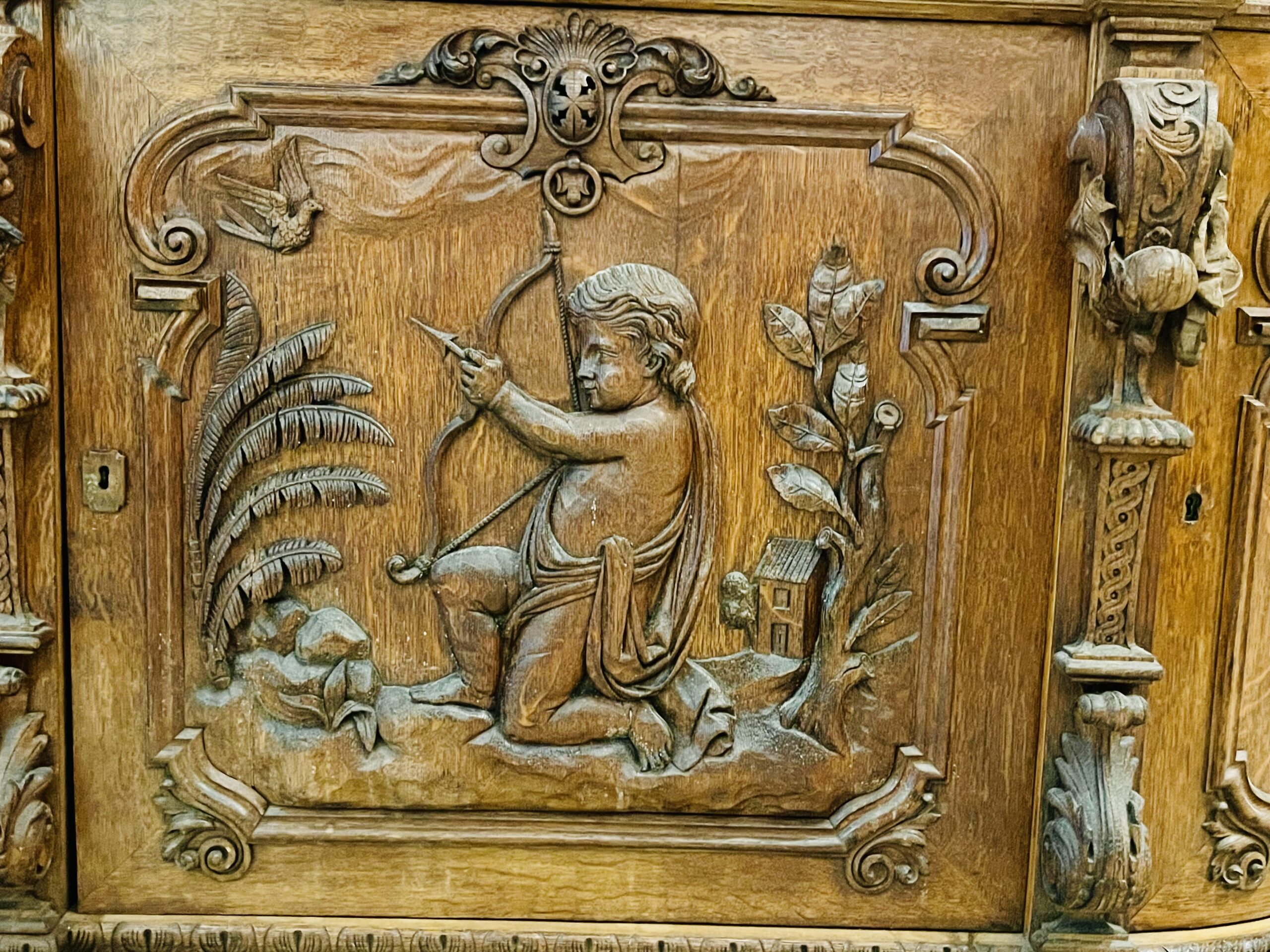 Dividido em duas partes com aparador e espelho e ricamente decorado com entalhes esculturais tridimensionais que representam cena de caça, cachos de uvas e motivos ornamentais de meninos, plantas e animais. A parte superior apresenta dois putti em figura completa com um pássaro na mão, entre videiras com uvas e folhas. Entre eles, um grande brasão com aves de caça e ramos entrelaçados. Abaixo, uma prateleira semicircular sustentada por dois grifos entalhados com mestria que assentam sobre um grande tampo de mármore branco estriado com um espelho. O móvel de base, tem quatro portas e quatro gavetas, em alto-relevo esculpido retratando meninos e cenas de caça, ladeada por feixes e pequenos arbustos, guirlandas alegóricas esculpidas com laços. Tudo isso emoldurado por molduras trabalhadas e painéis de carvalho.