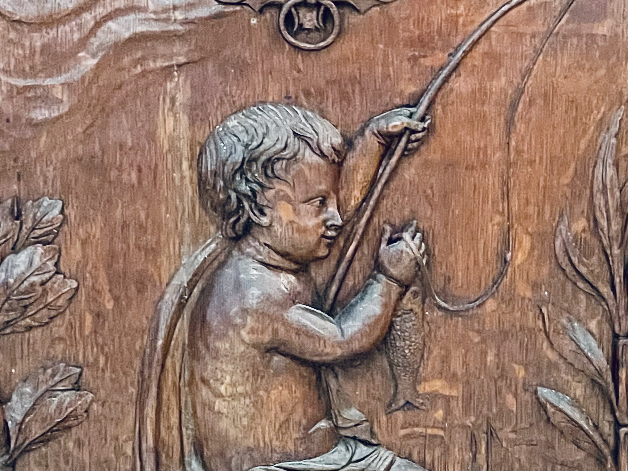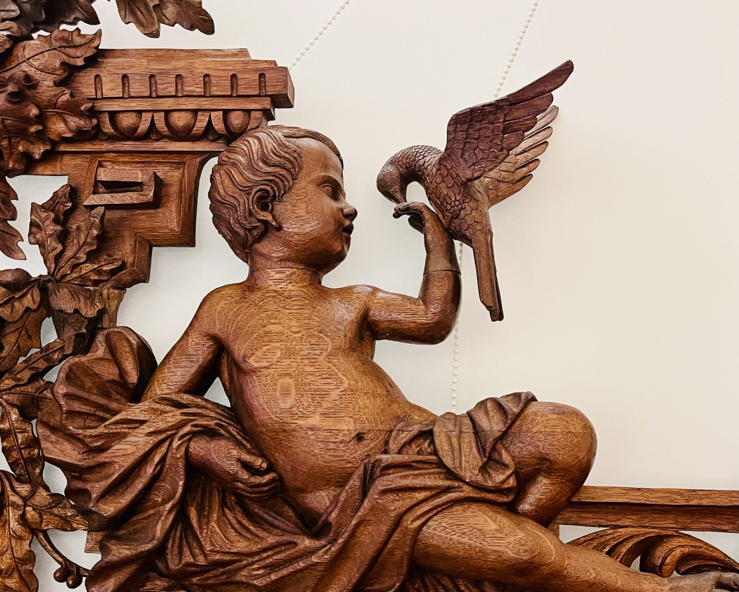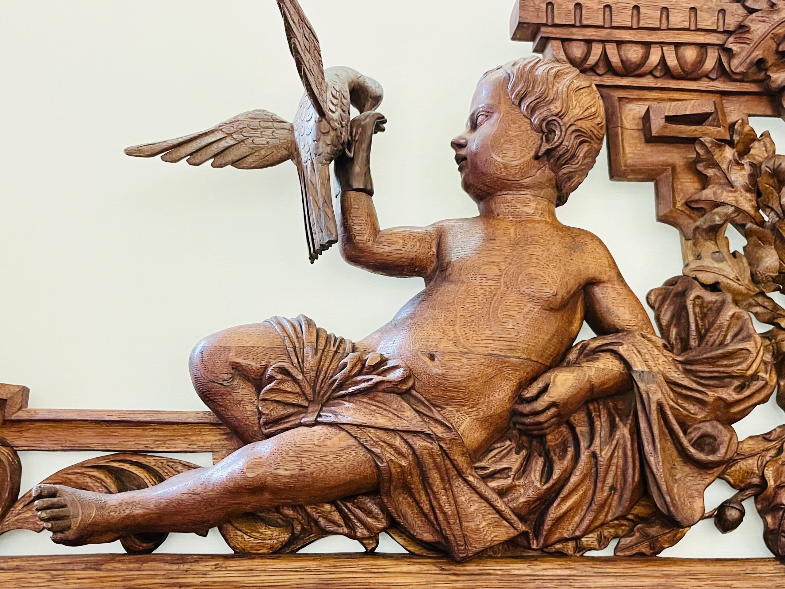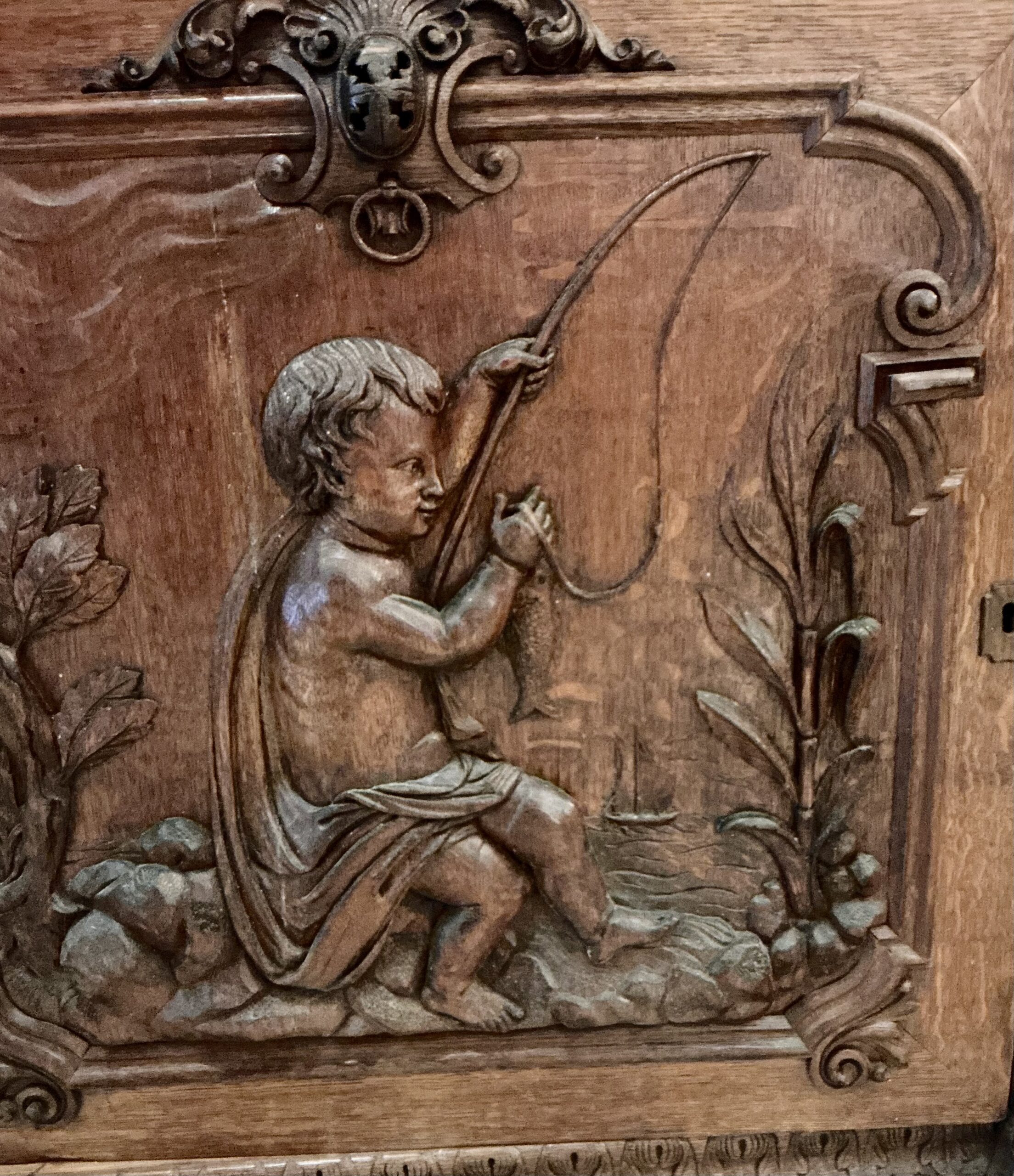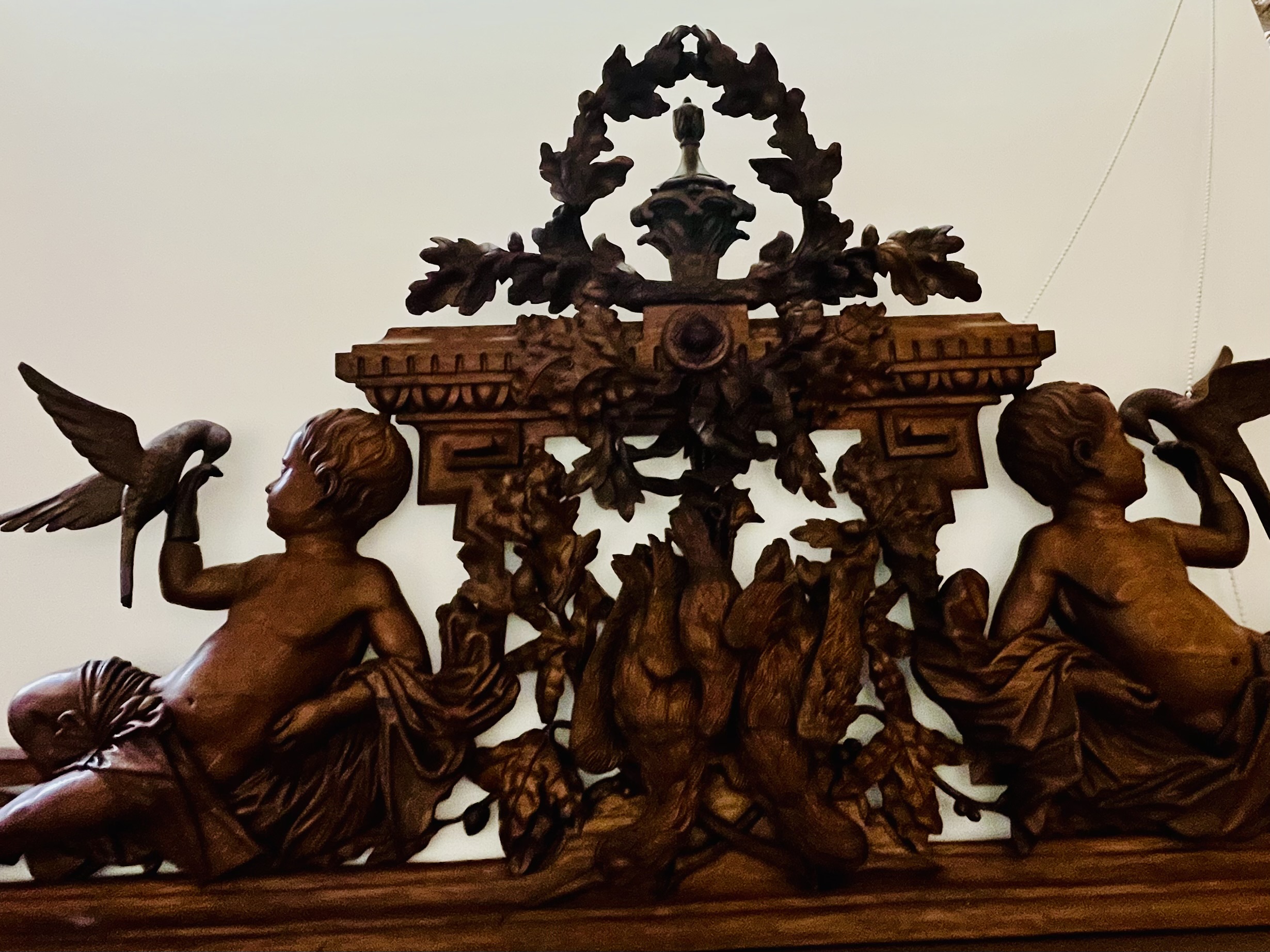 Dividido em duas partes com aparador e espelho e ricamente decorado com entalhes esculturais tridimensionais que representam cena de caça, cachos de uvas e motivos ornamentais de meninos, plantas e animais. A parte superior apresenta dois putti em figura completa com um pássaro na mão, entre videiras com uvas e folhas. Entre eles, um grande brasão com aves de caça e ramos entrelaçados. Abaixo, uma prateleira semicircular sustentada por dois grifos entalhados com mestria que assentam sobre um grande tampo de mármore branco estriado com um espelho. O móvel de base, tem quatro portas e quatro gavetas, em alto-relevo esculpido retratando meninos e cenas de caça, ladeada por feixes e pequenos arbustos, guirlandas alegóricas esculpidas com laços. Tudo isso emoldurado por molduras trabalhadas e painéis de carvalho.