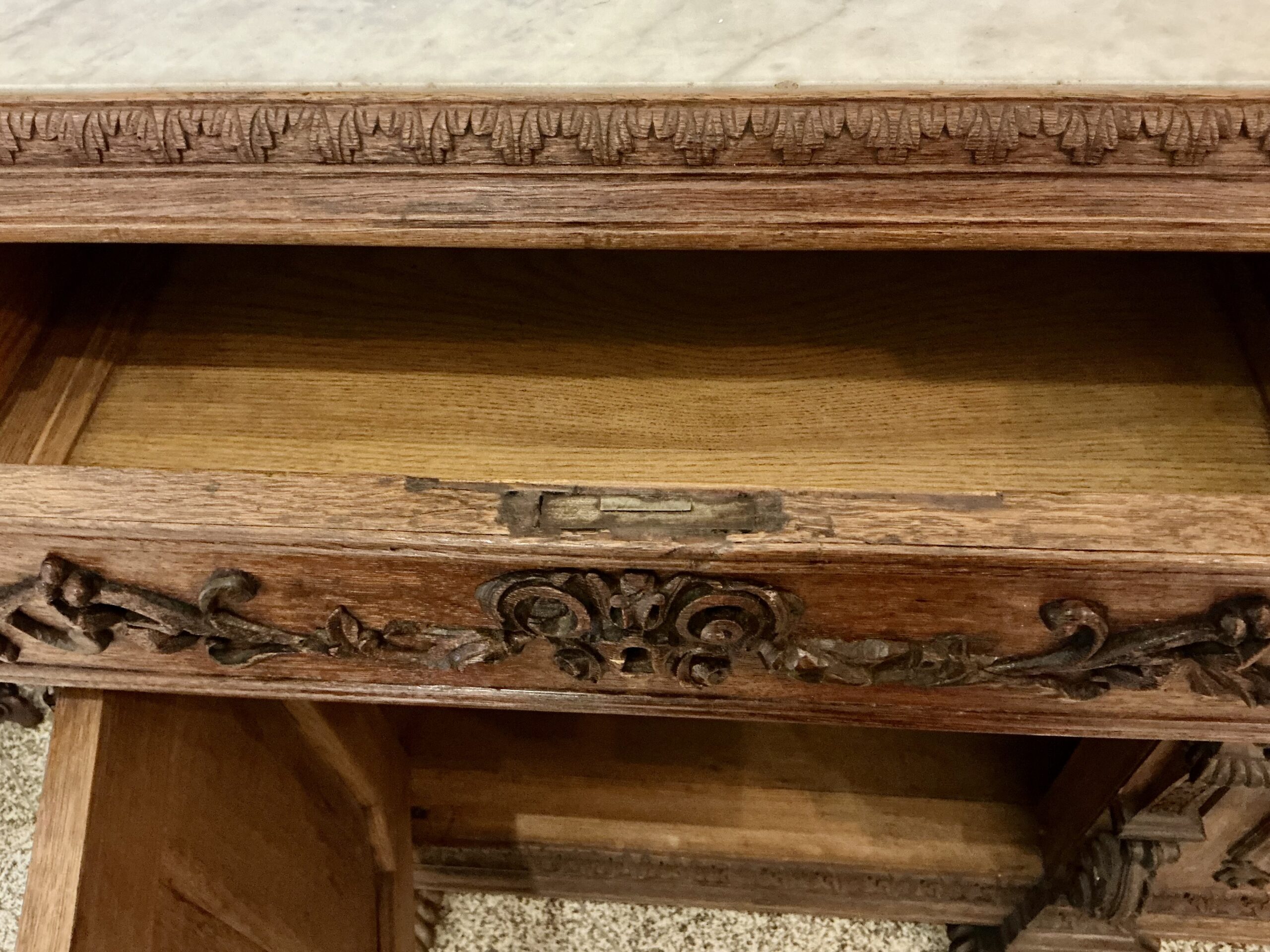 Importante móvel renascentista em carvalho Francês com grande tampo de mármore.