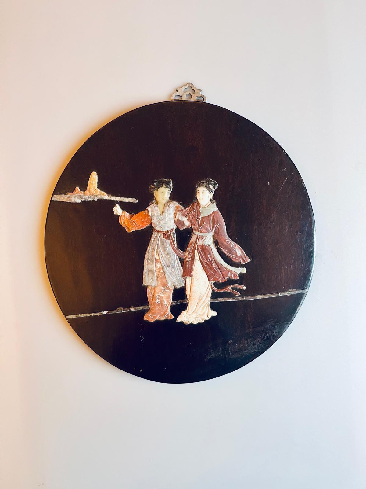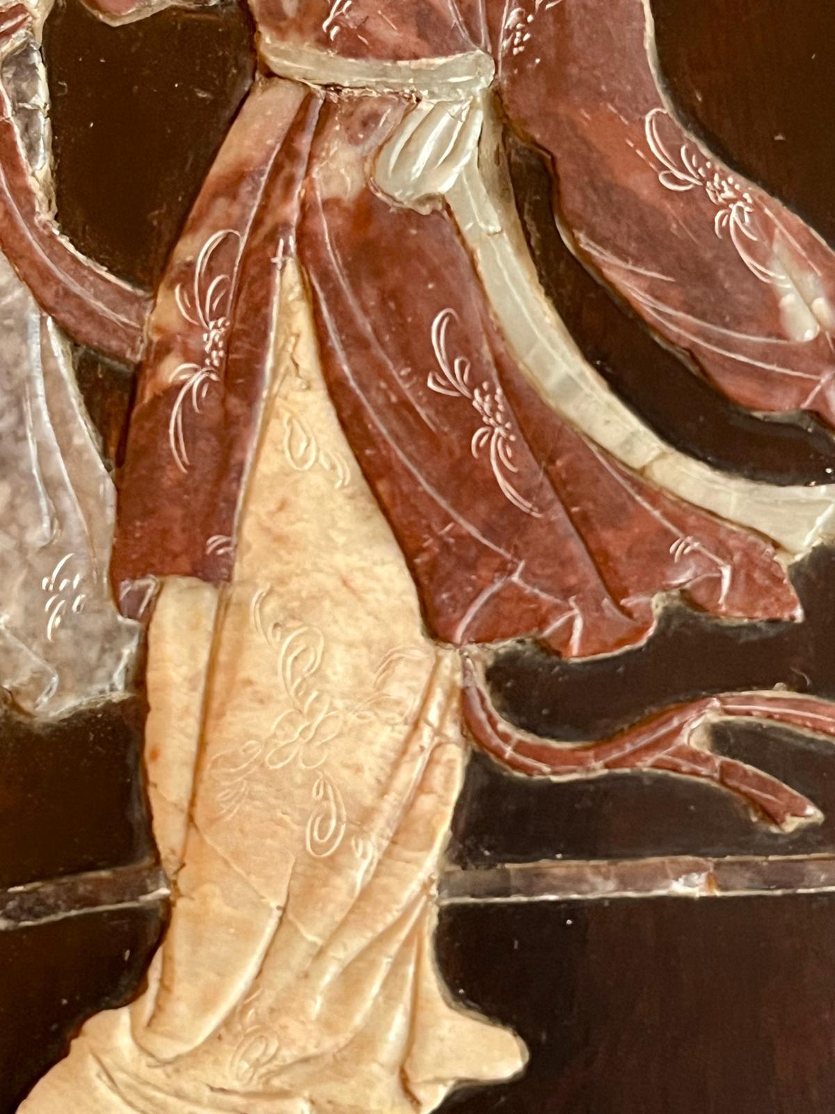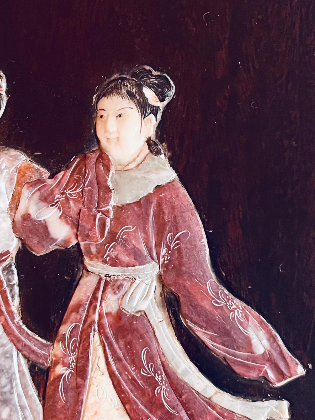 Painel de madeira Jacarandá com figuras incrustadas em pedra, China