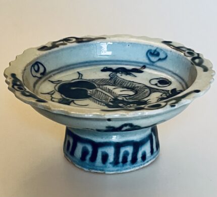 Copo com pé em porcelana chinesa, decorado com dragão a azul e branco esmaltado, dinastia Qing (Séc XIX)