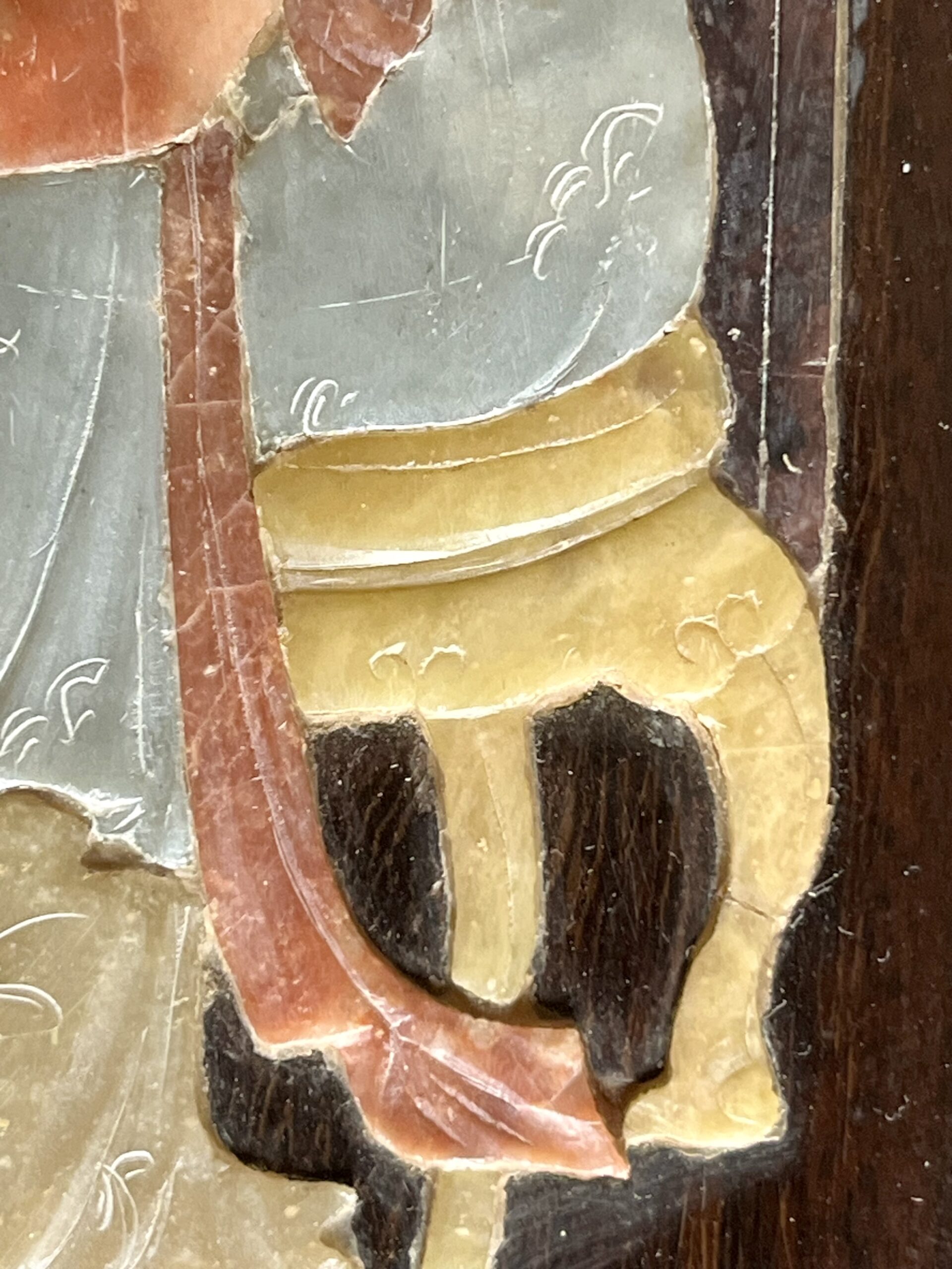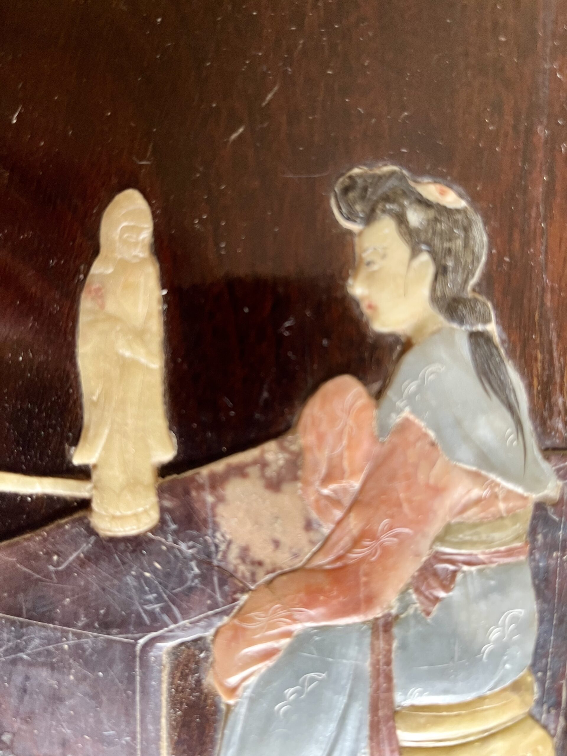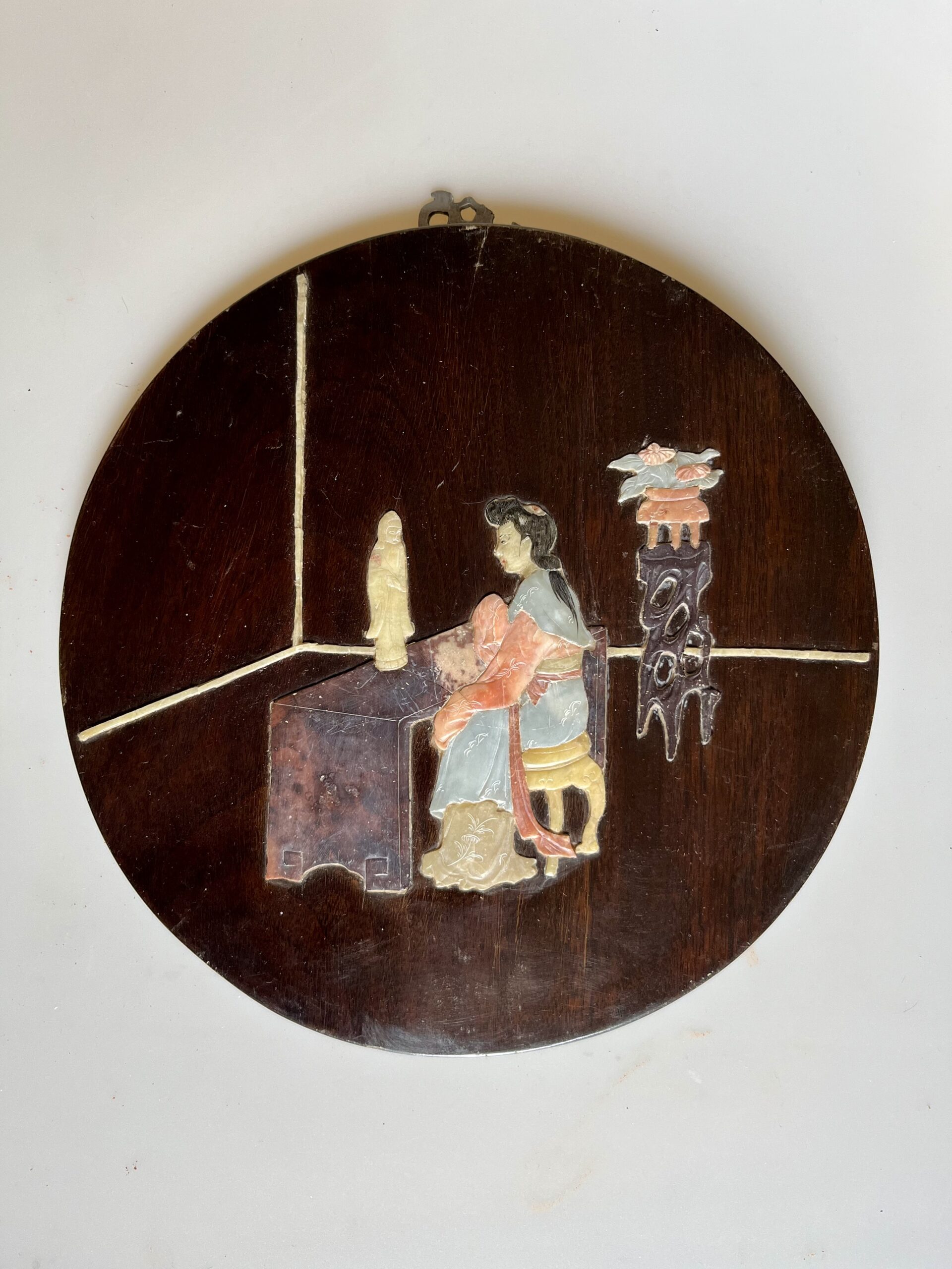 Painel em madeira de Jaracandá com rara figura de altar Guanyn em pedra colorida