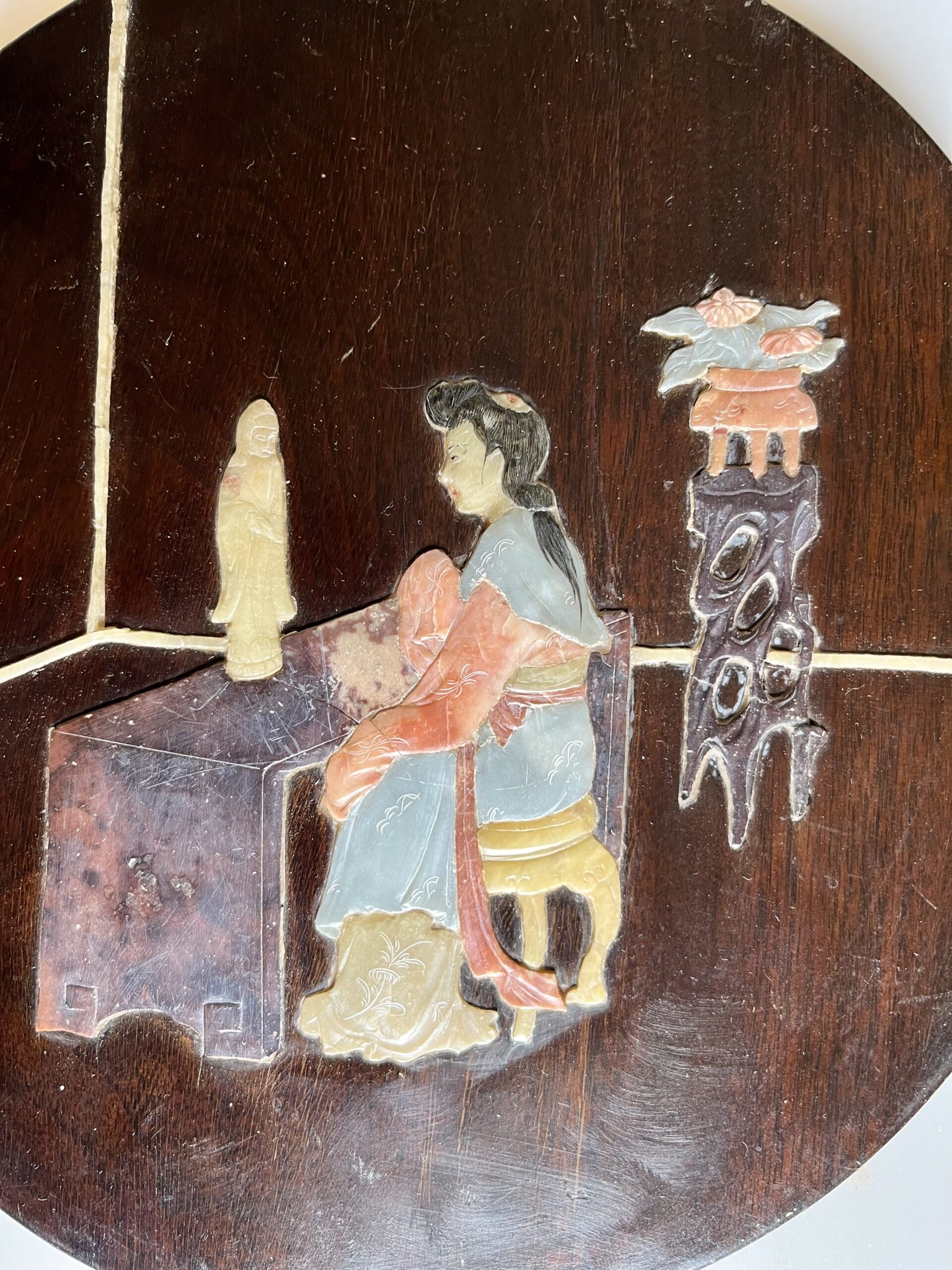 Painel de parede antigo chinês com figuras em pedra esculpida incrustada.