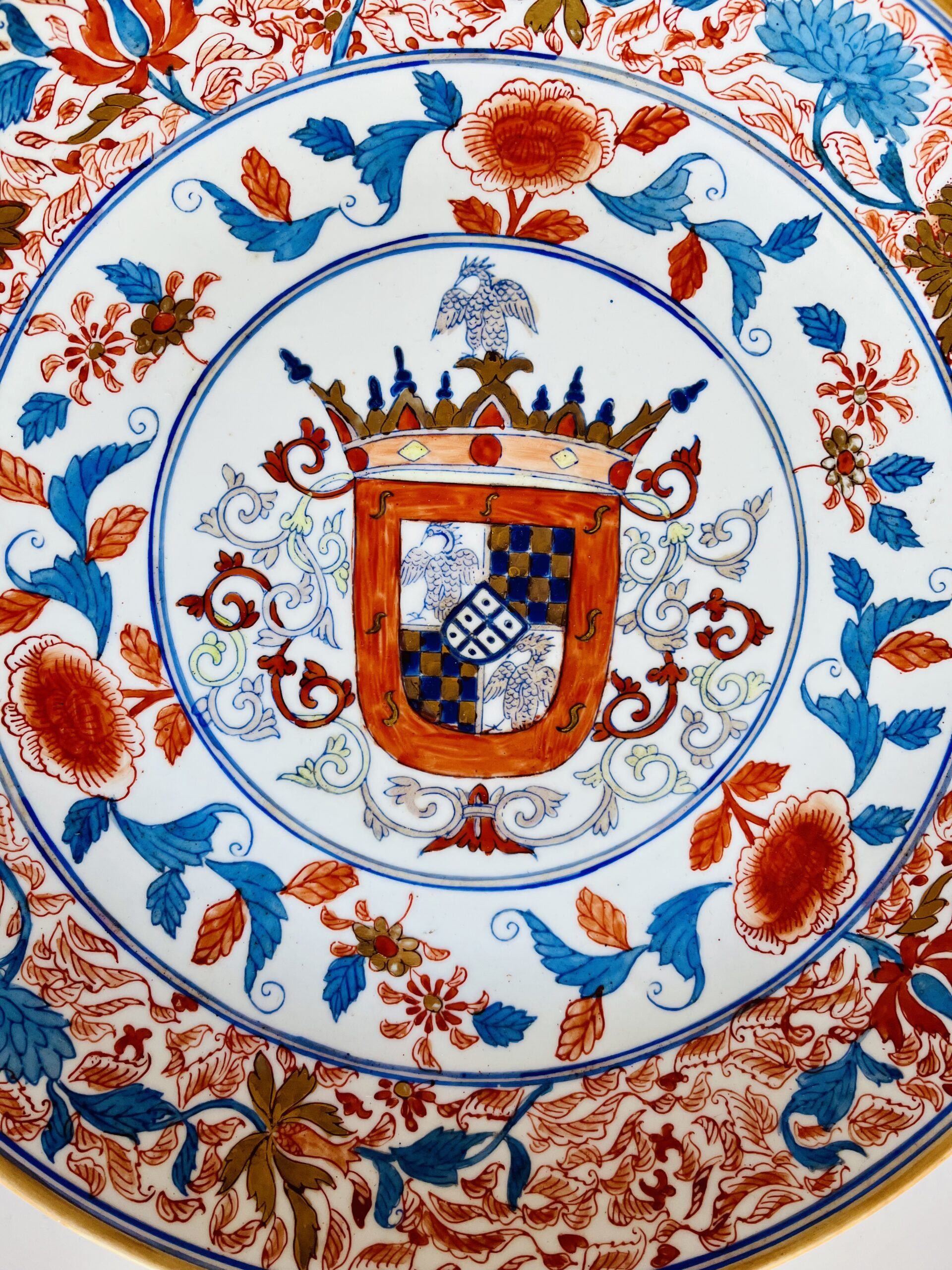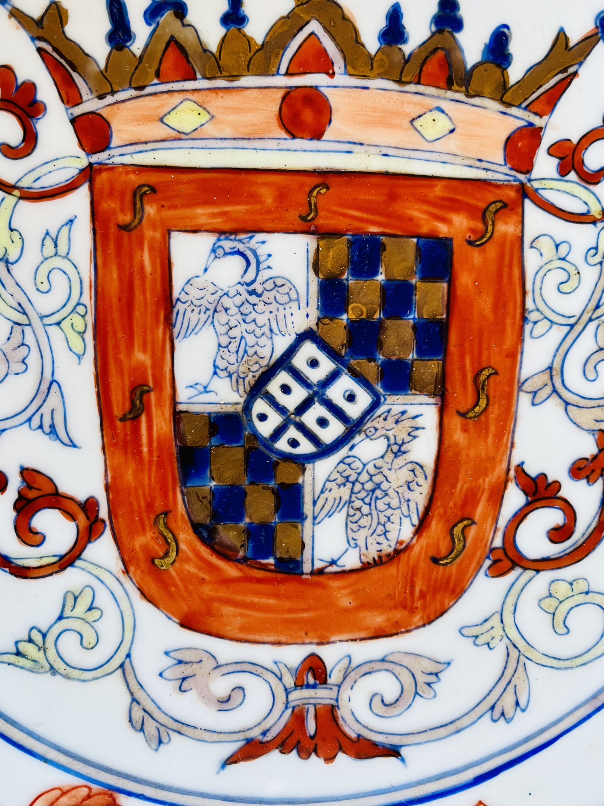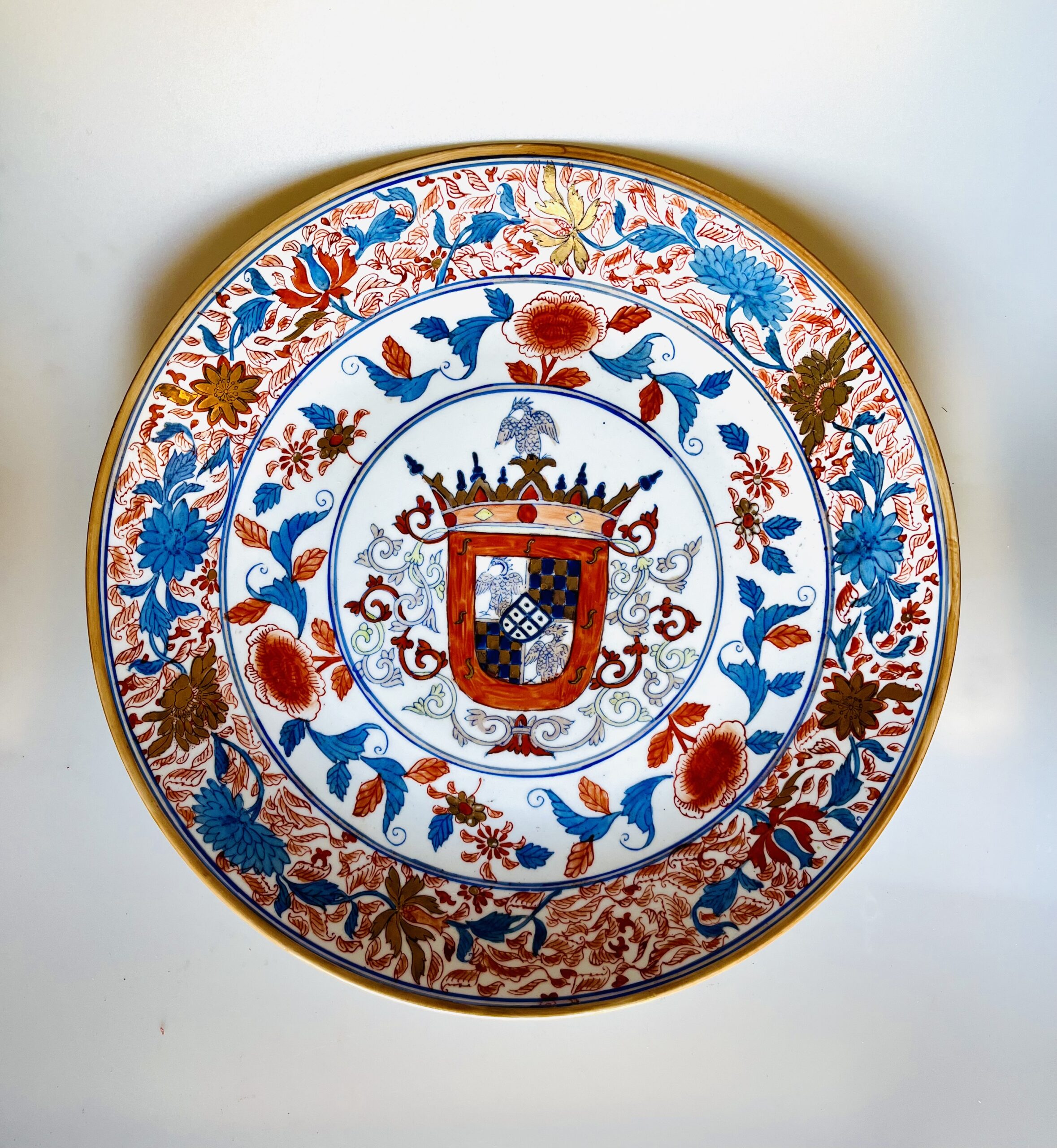 Prato de grandes dimensões, porcelana Chinesa, decoração policromada com armas de Sampaio e Melo, tradicionalmente atribuídas a Francisco José de Sampaio Melo e Castro, Vice-Rei da Índia.