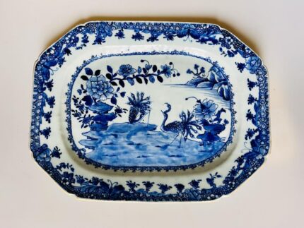 Travessa oitavada em porcelana Chinesa Companhia das Indias, reinado Qianlong (1735-1795), decoração azul e branco com paisagem floral e pavões num lago.