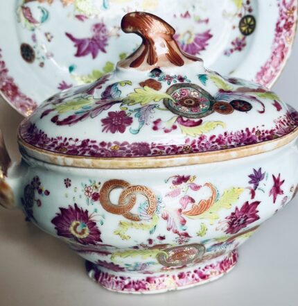 Terrina com apresentador em porcelana Chinesa de exportação, decoração policromada e dourada "Pseudo Folha de Tabaco", Reinado Qianlong (1736-1795)