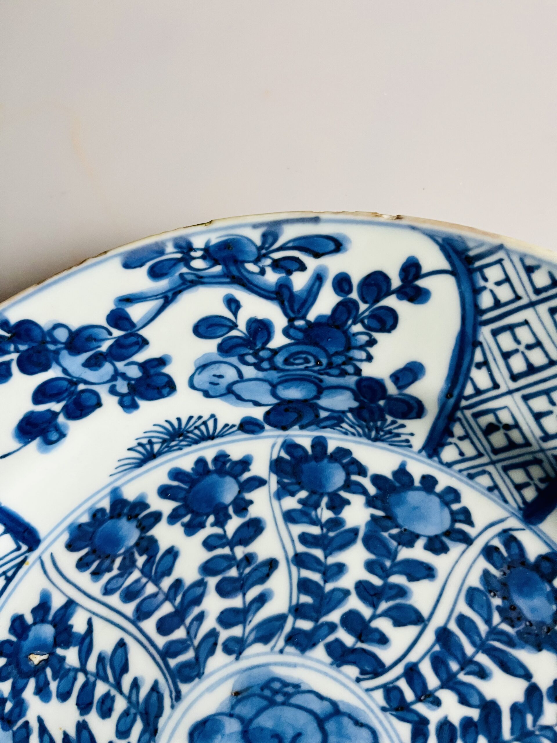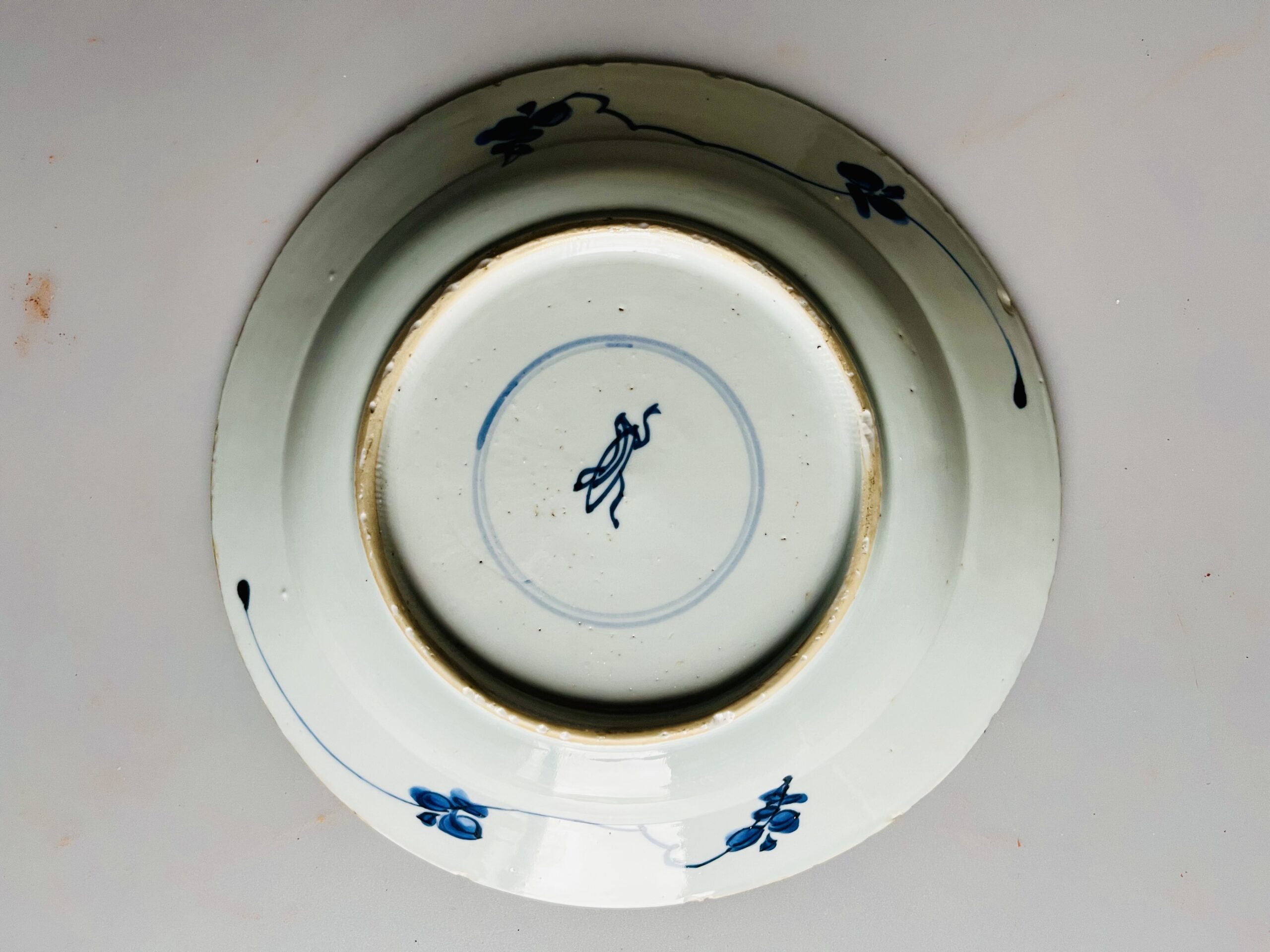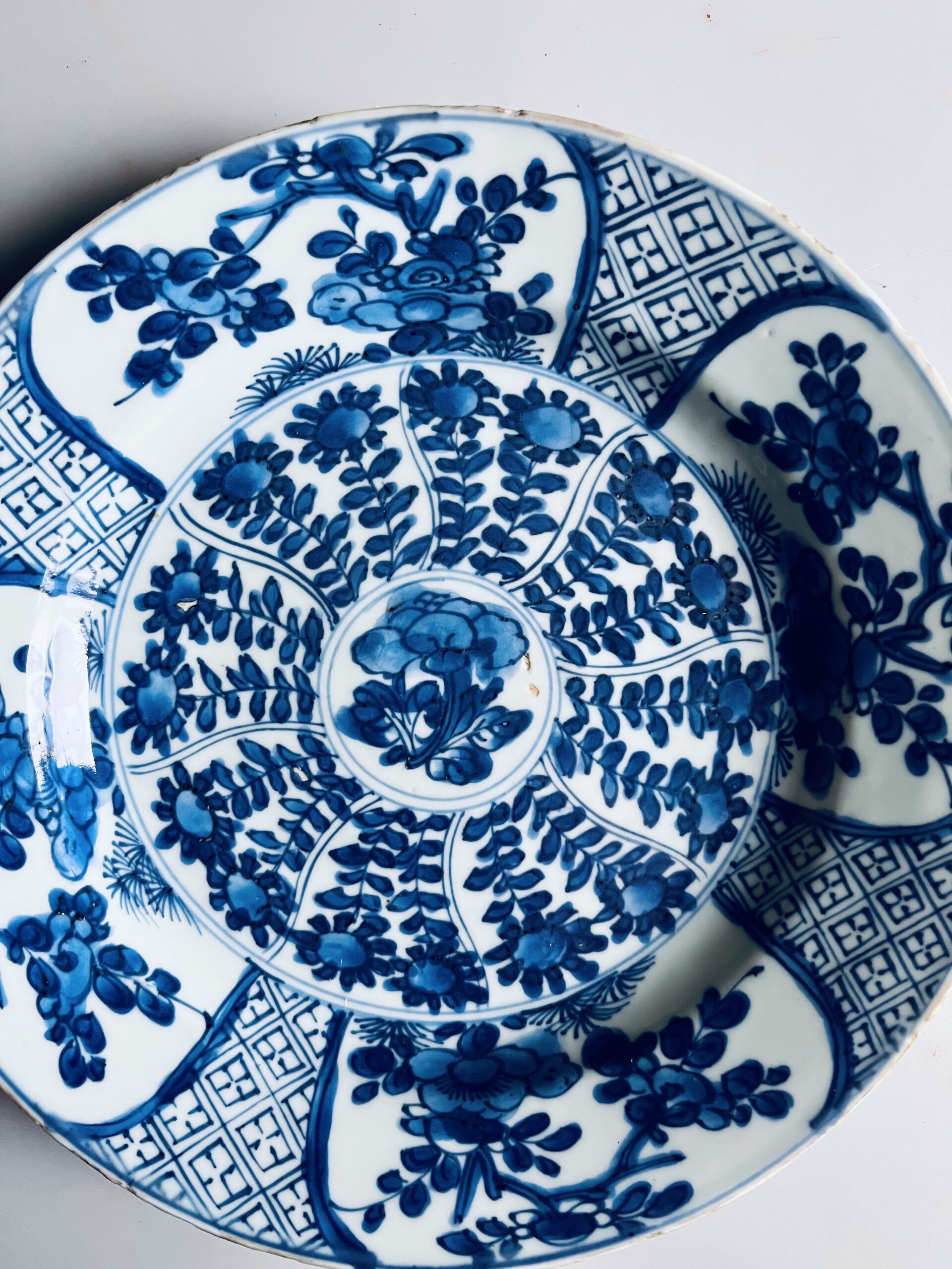 Prato em porcelana chinesa azul e branco, decoração floral, período Kangxi (1662-1772), marcado.