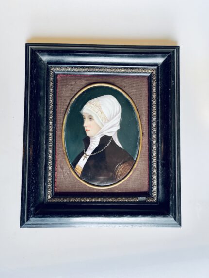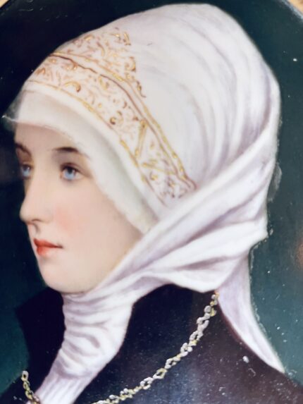 Placa de porcelana pintada de jovem religiosa com moldura em madeira e friso metálicoamanho: