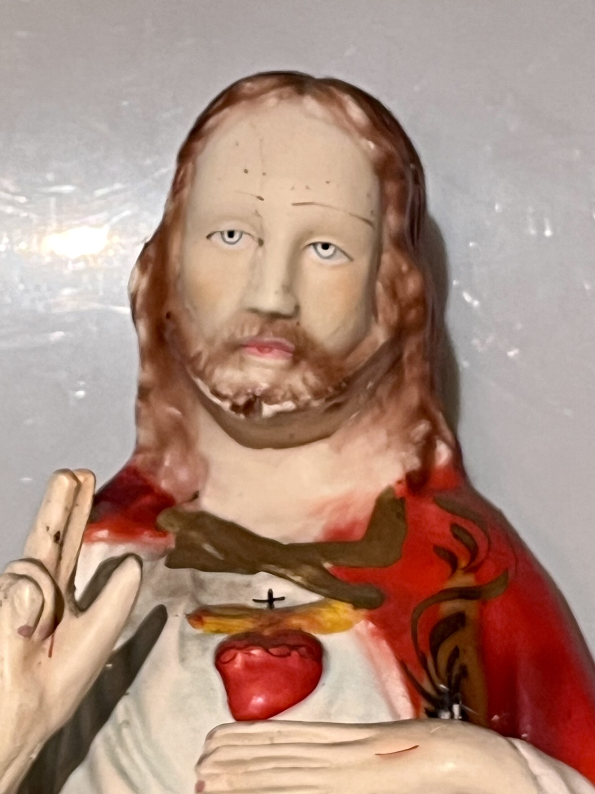 Cristo sagrado coração de Jesus em gesso, policromia popular com cores vivas e realistas, anos 60 do Séc, XX, de suspenção