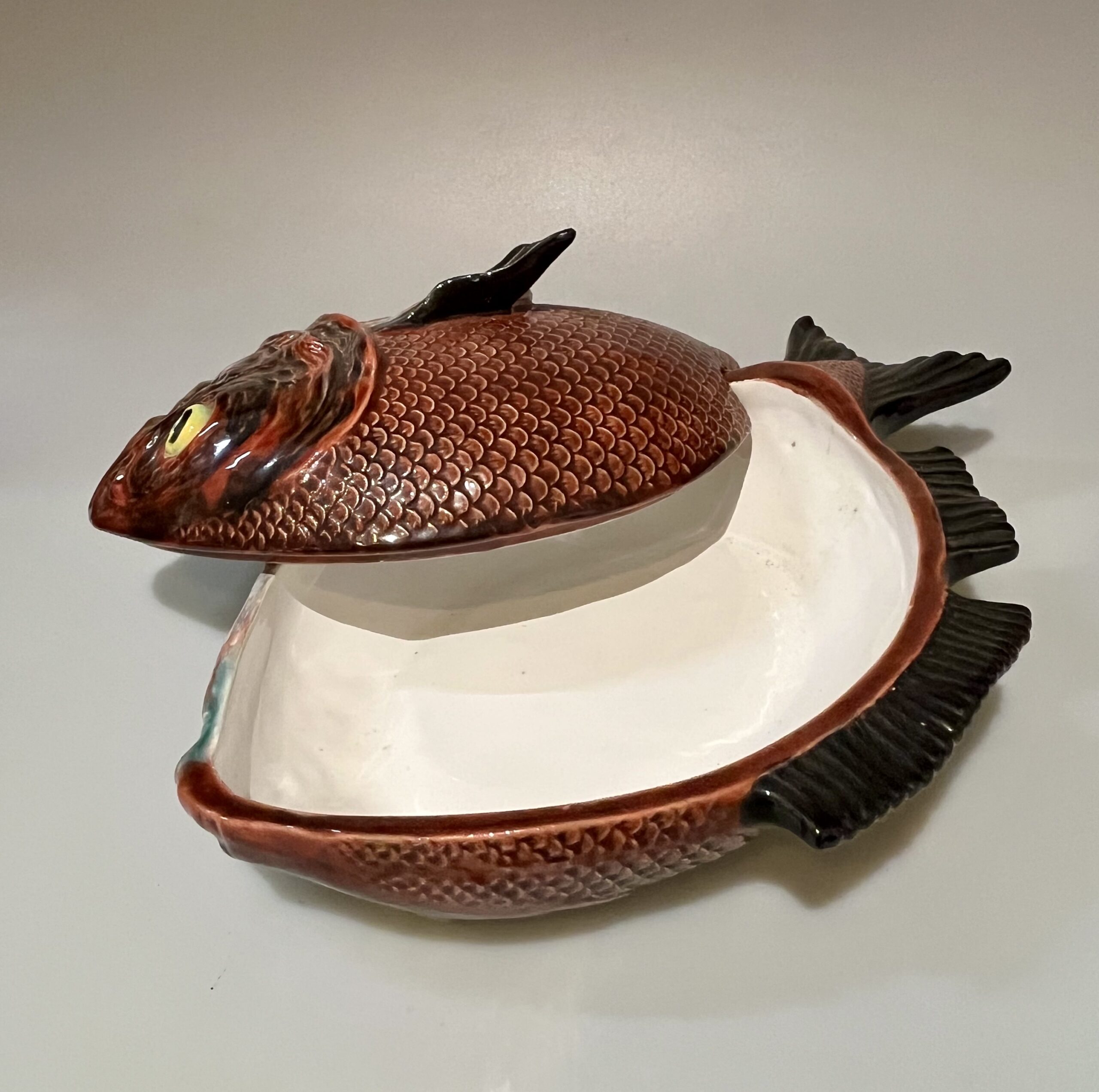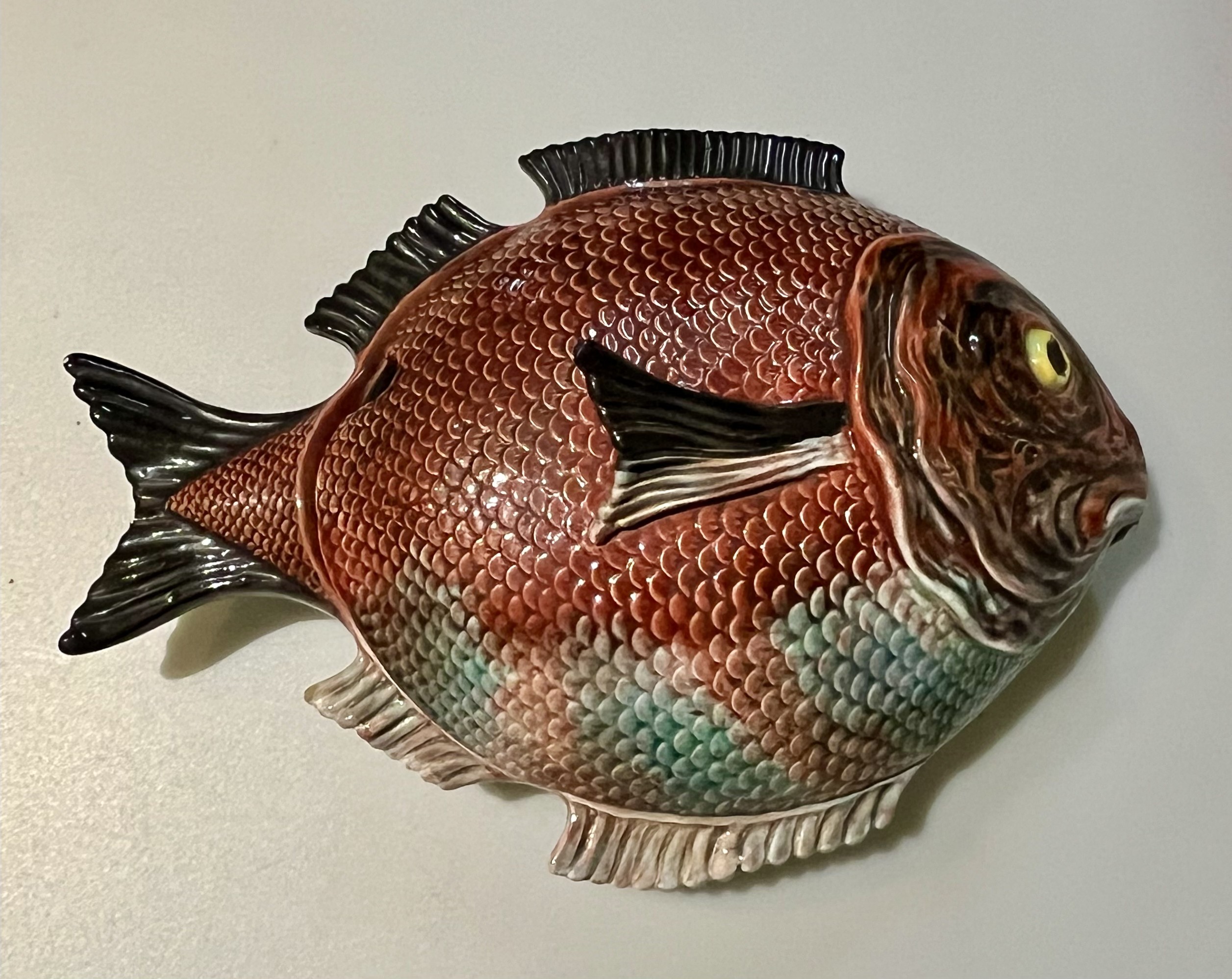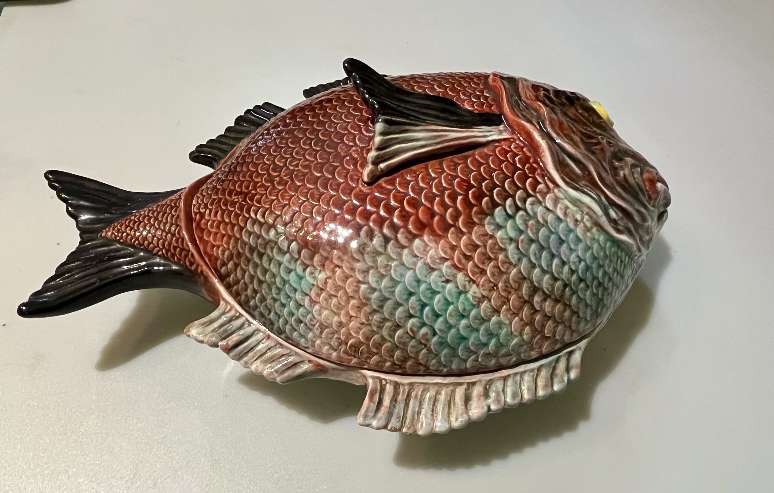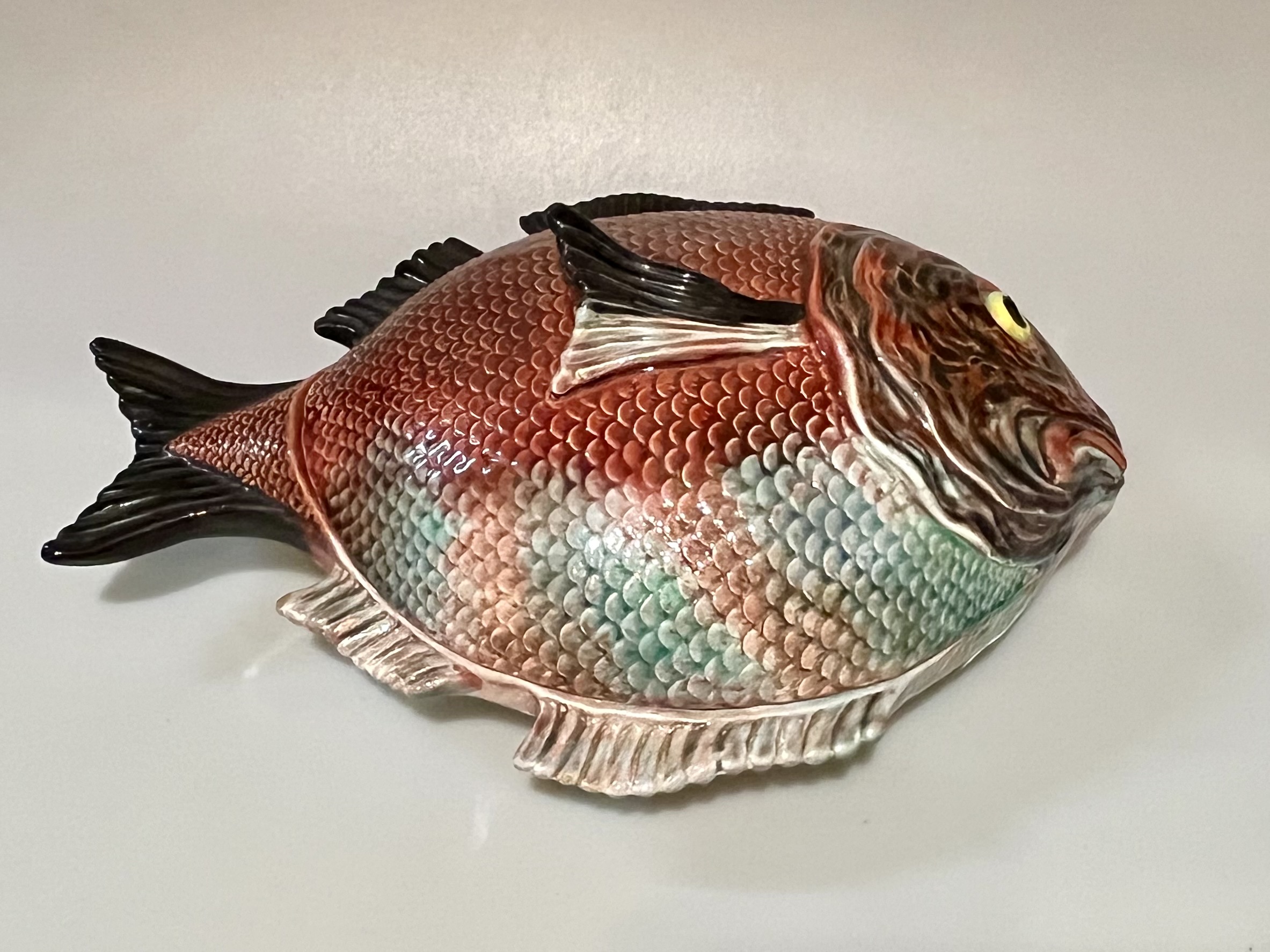 Terrina em forma de peixe, fabrico Caldas da Rainha, policromado com cores brilhantes em muito bom estado de conservação