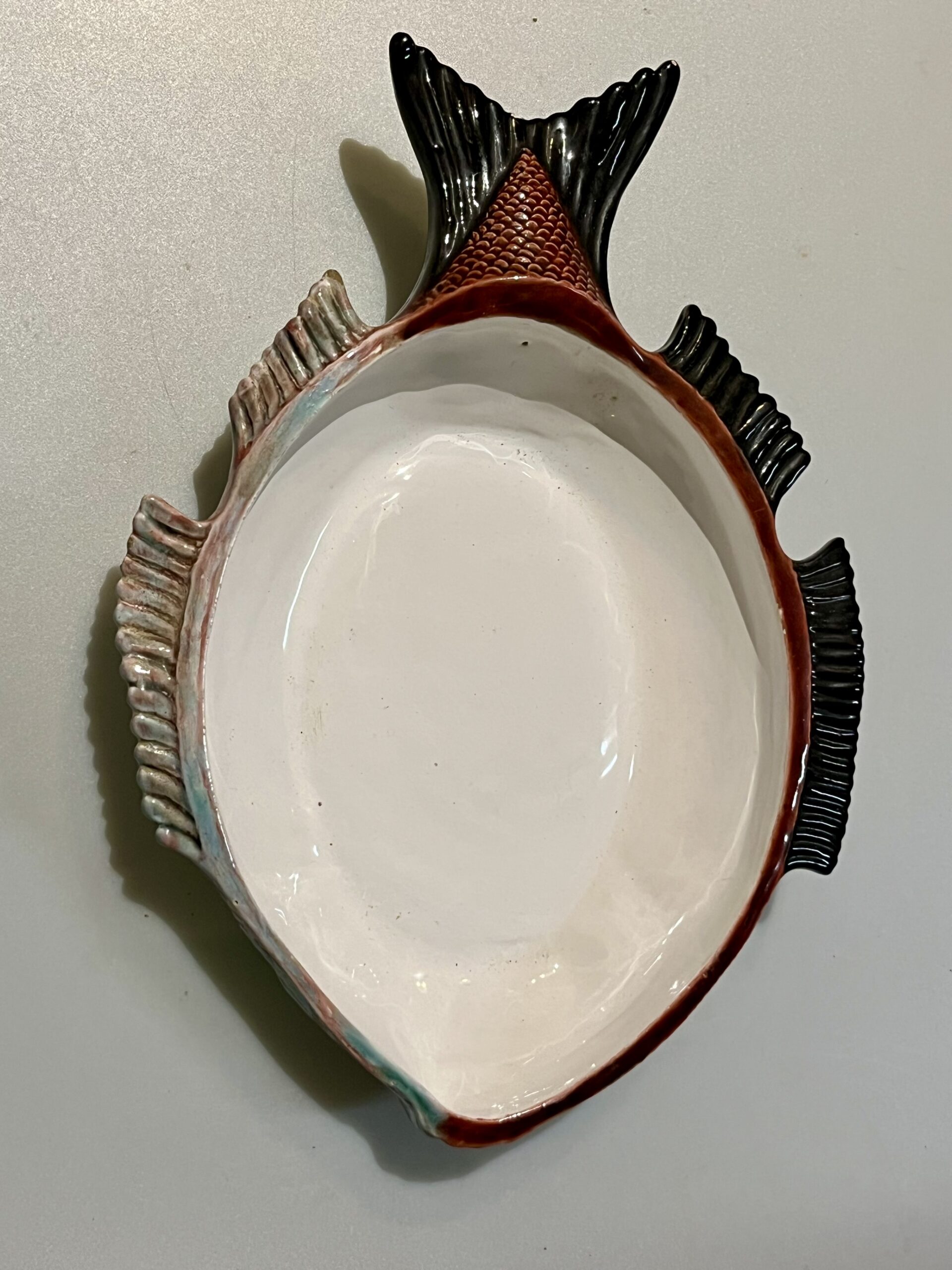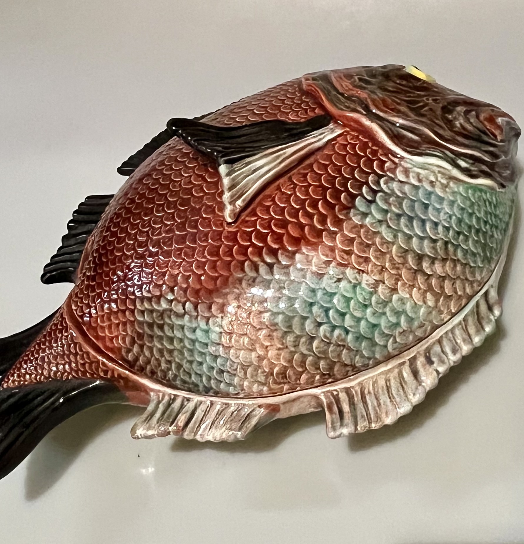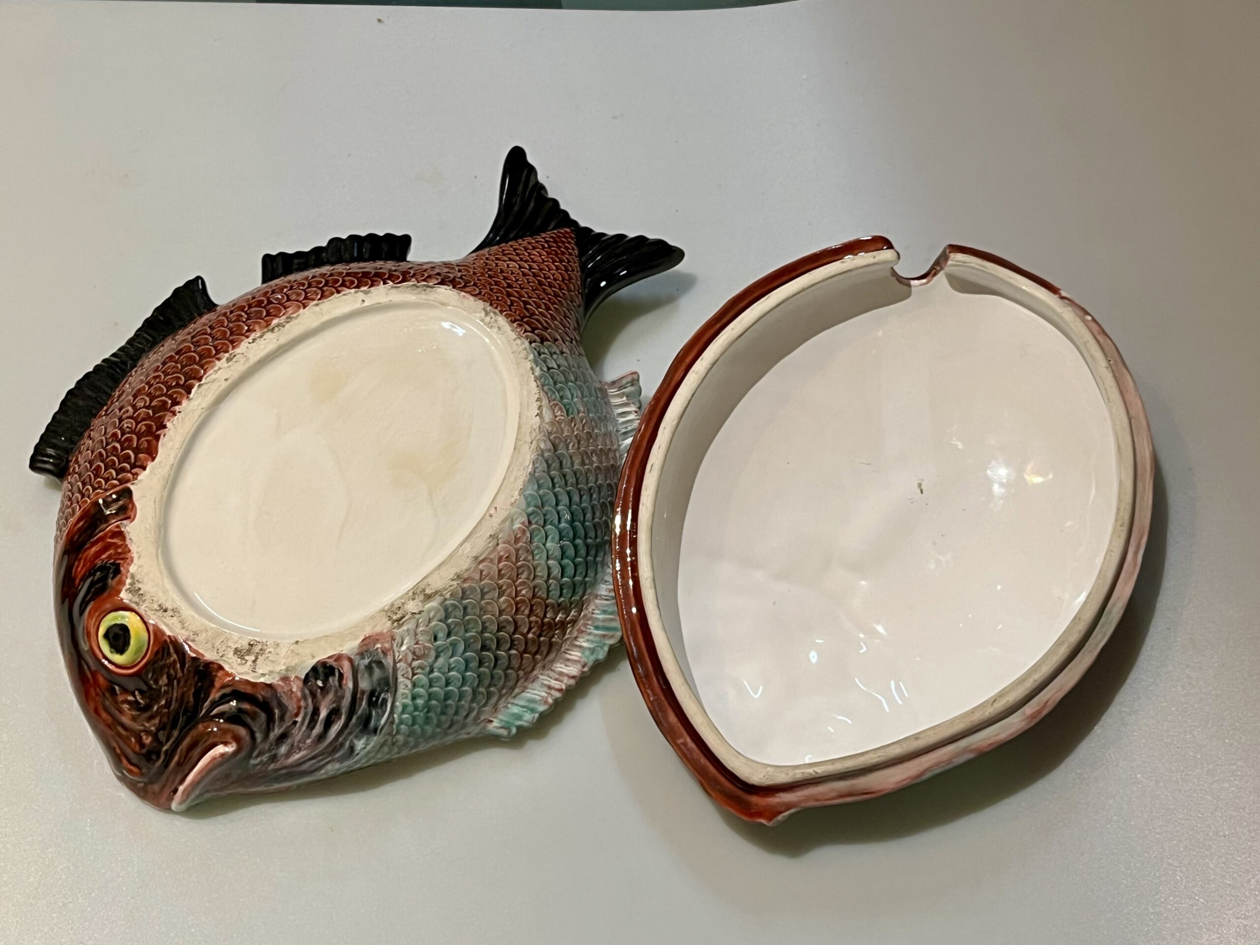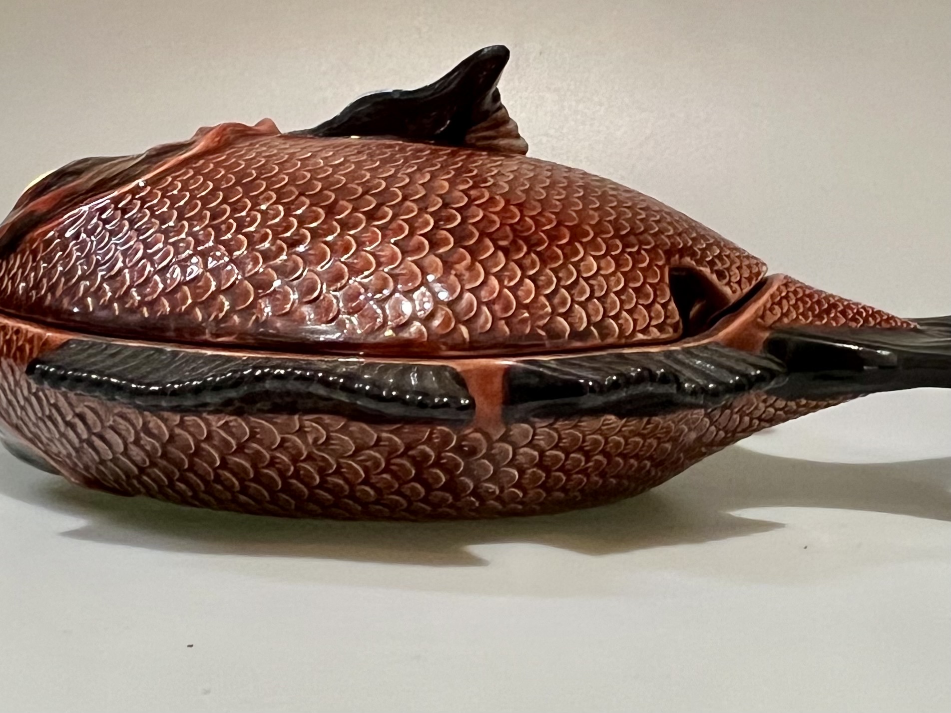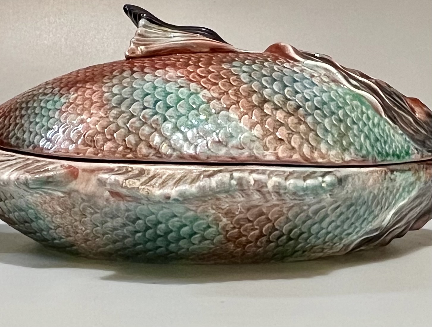 Terrina em forma de peixe, fabrico Caldas da Rainha, policromado com cores brilhantes em muito bom estado de conservação