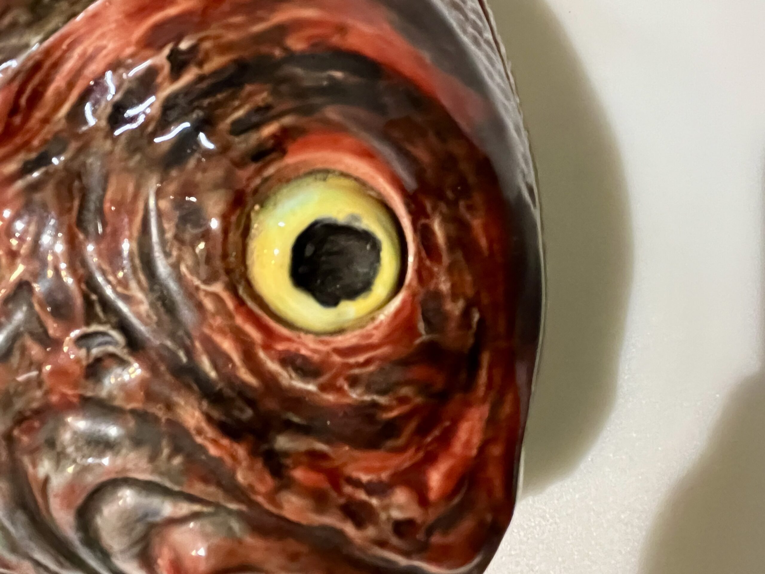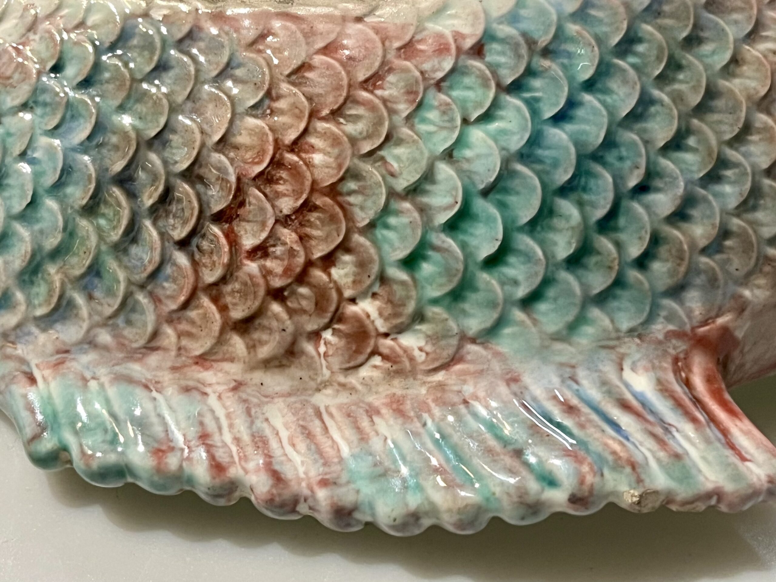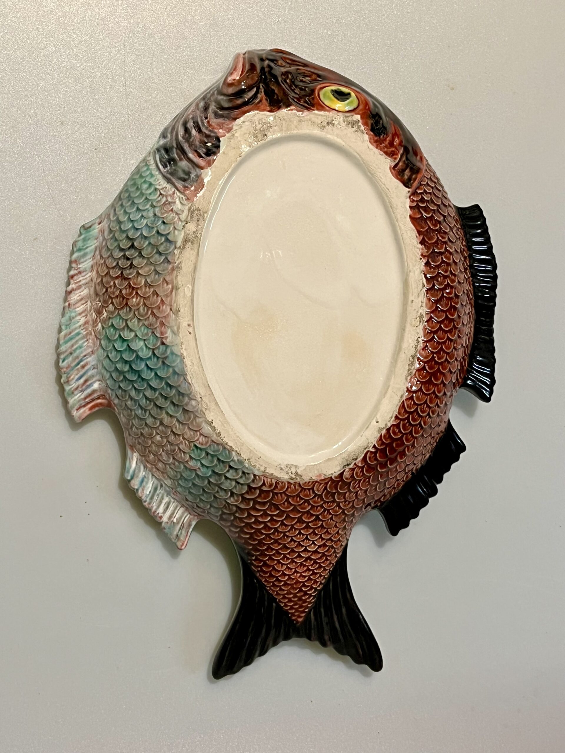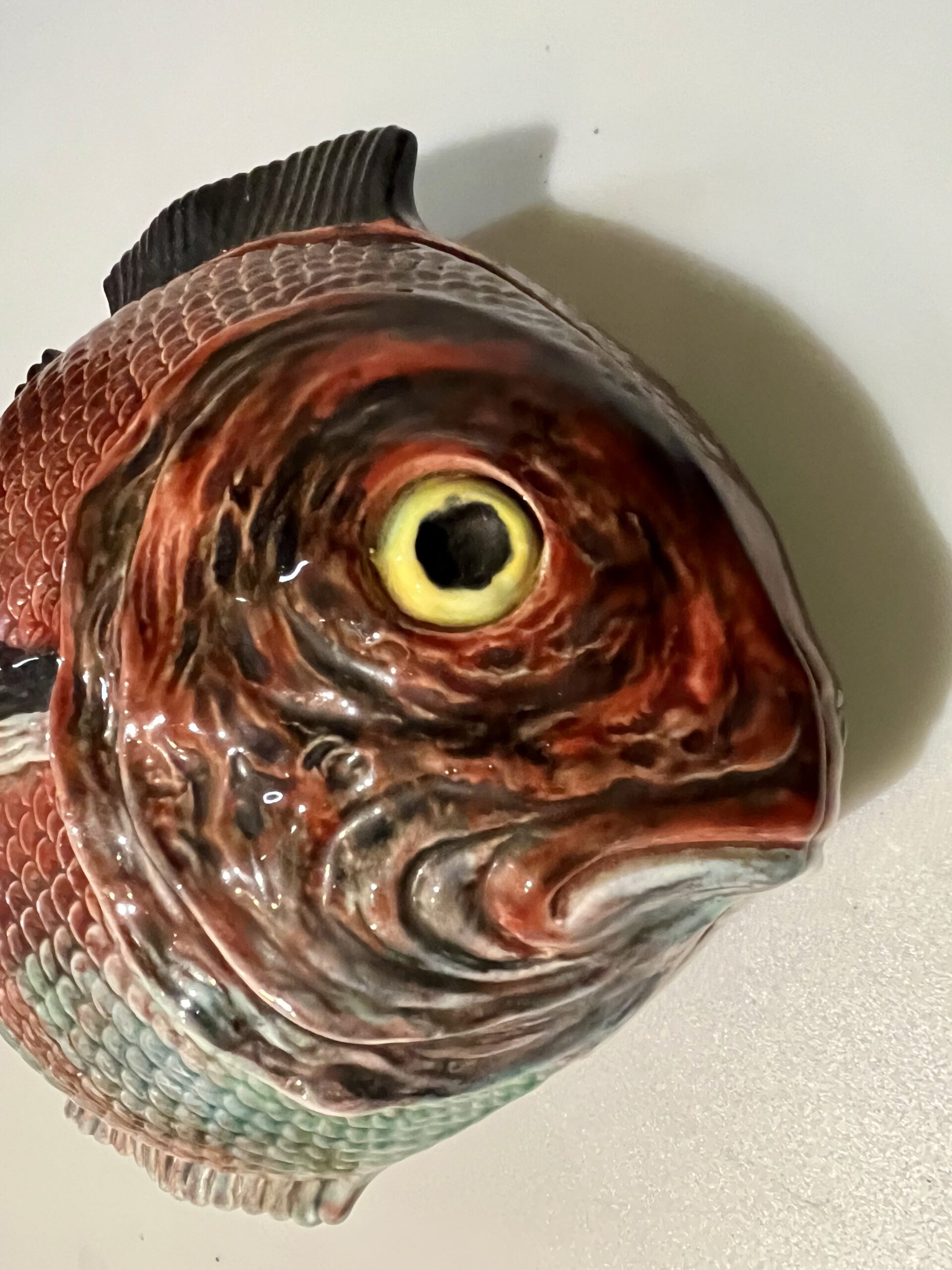 Terrina em forma de peixe, fabrico Caldas da Rainha, policromado com cores brilhantes em muito bom estado de conservação