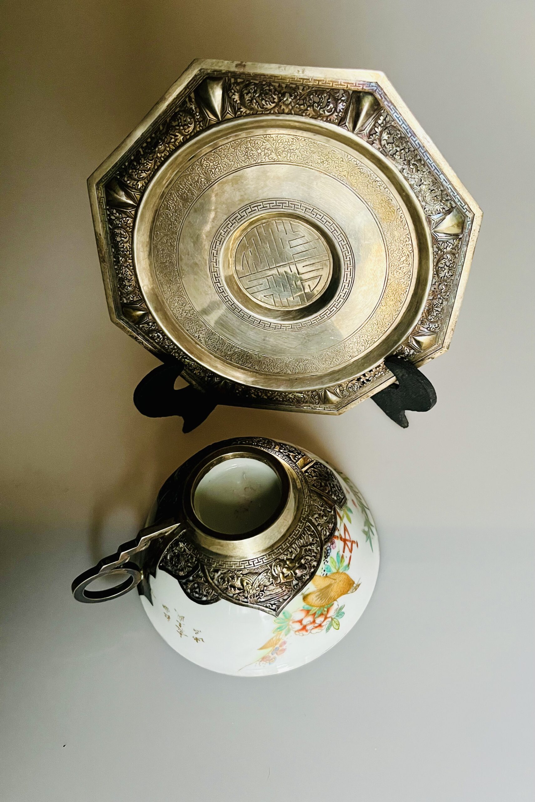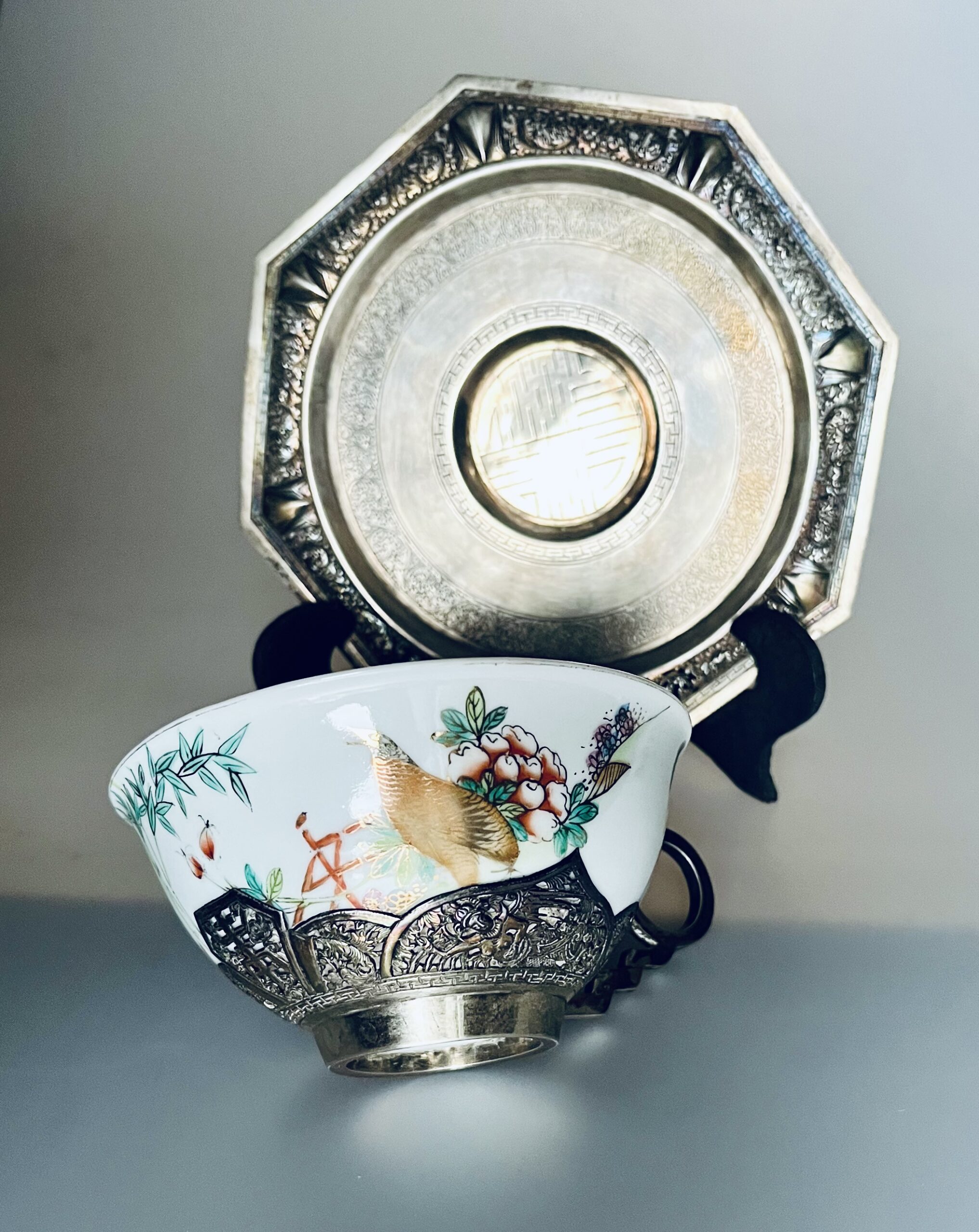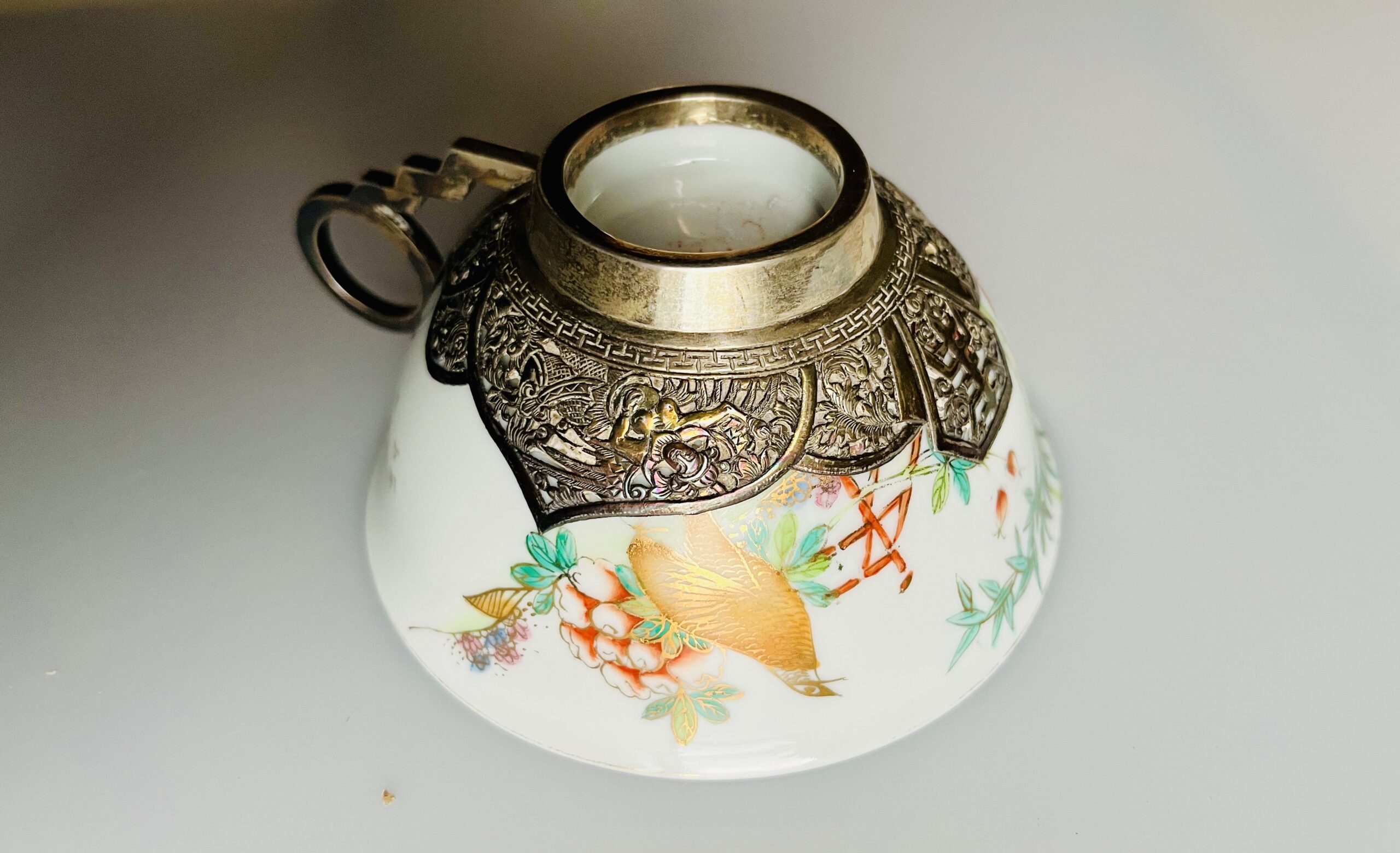 Taça para chá em porcelana chinesa decorada com ave e flores, produção para o mercado do Vietnã, com armação e pires em prata maciça de lei