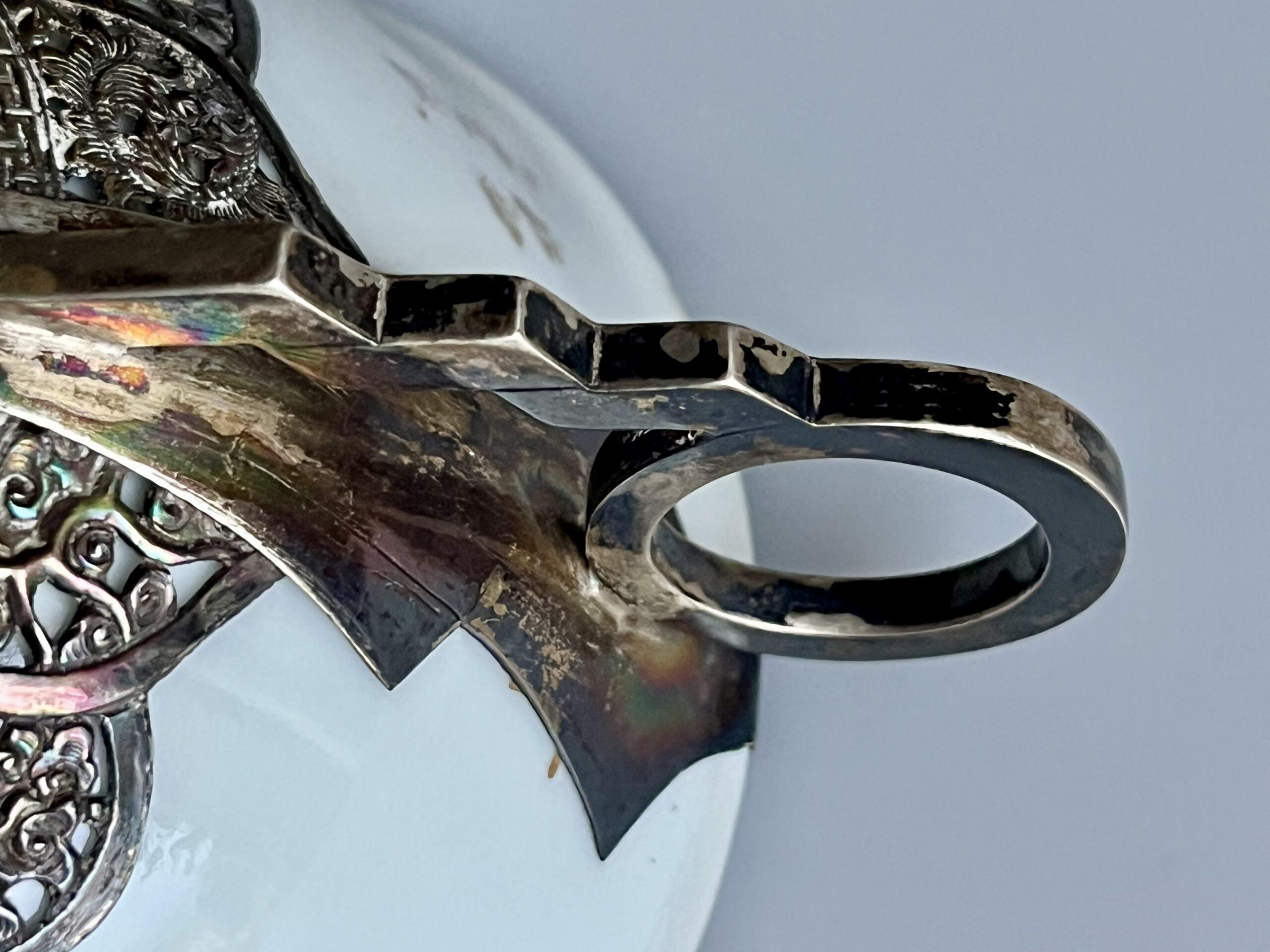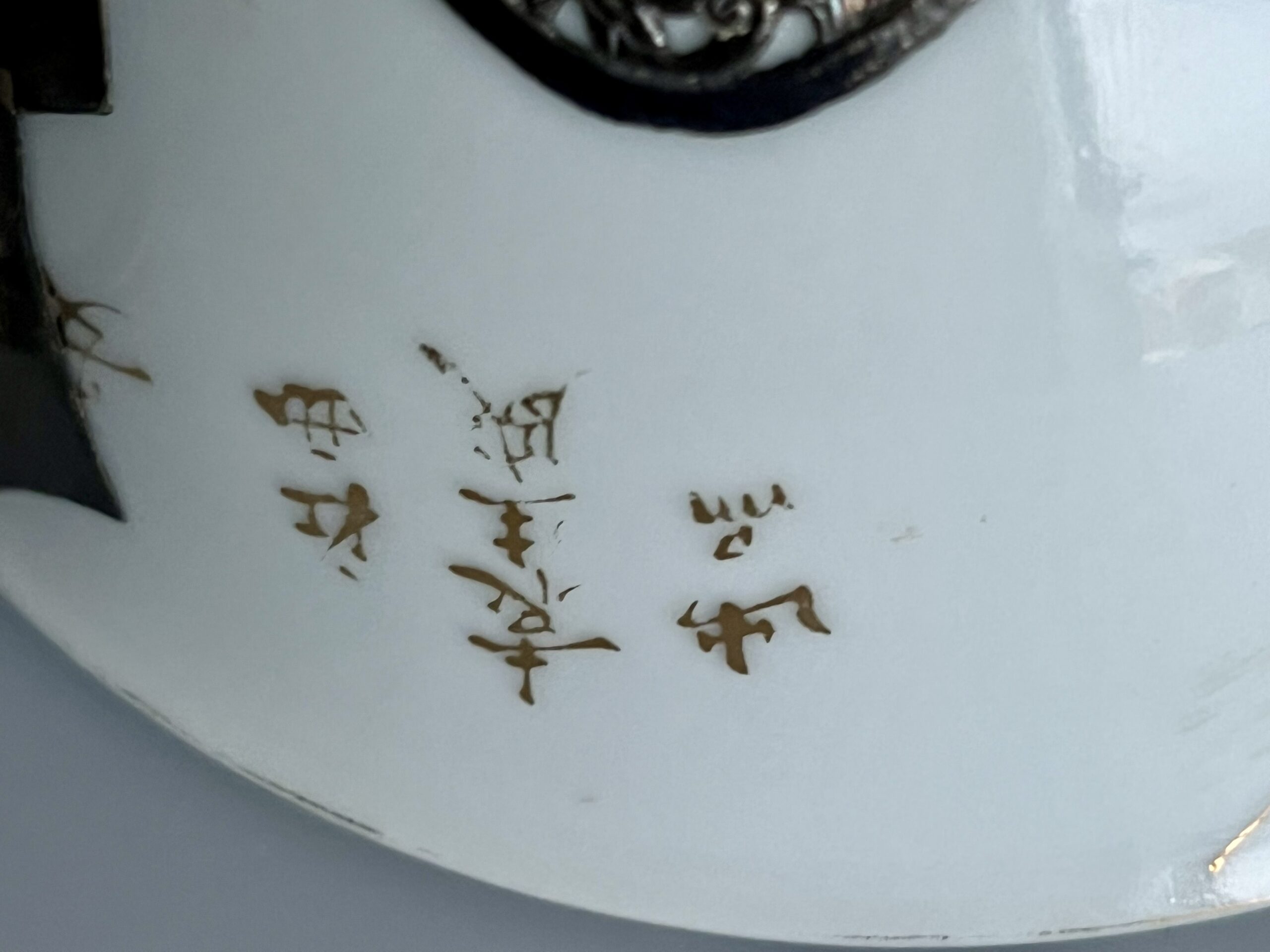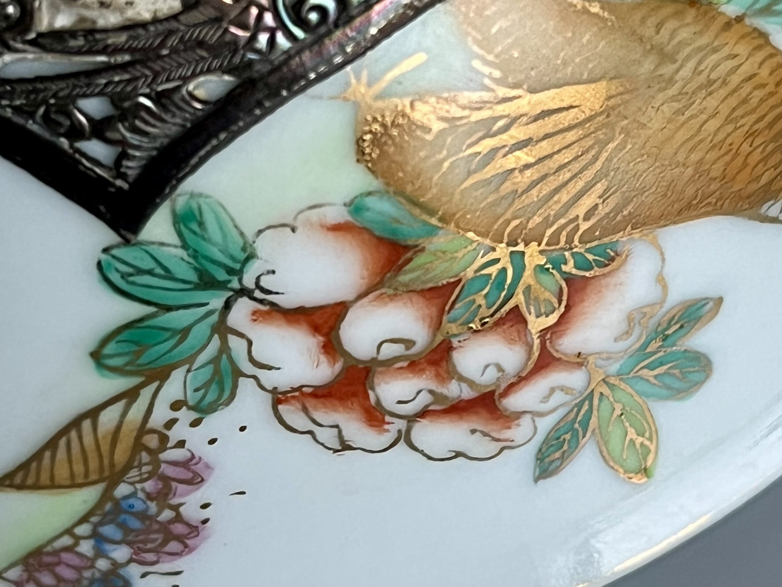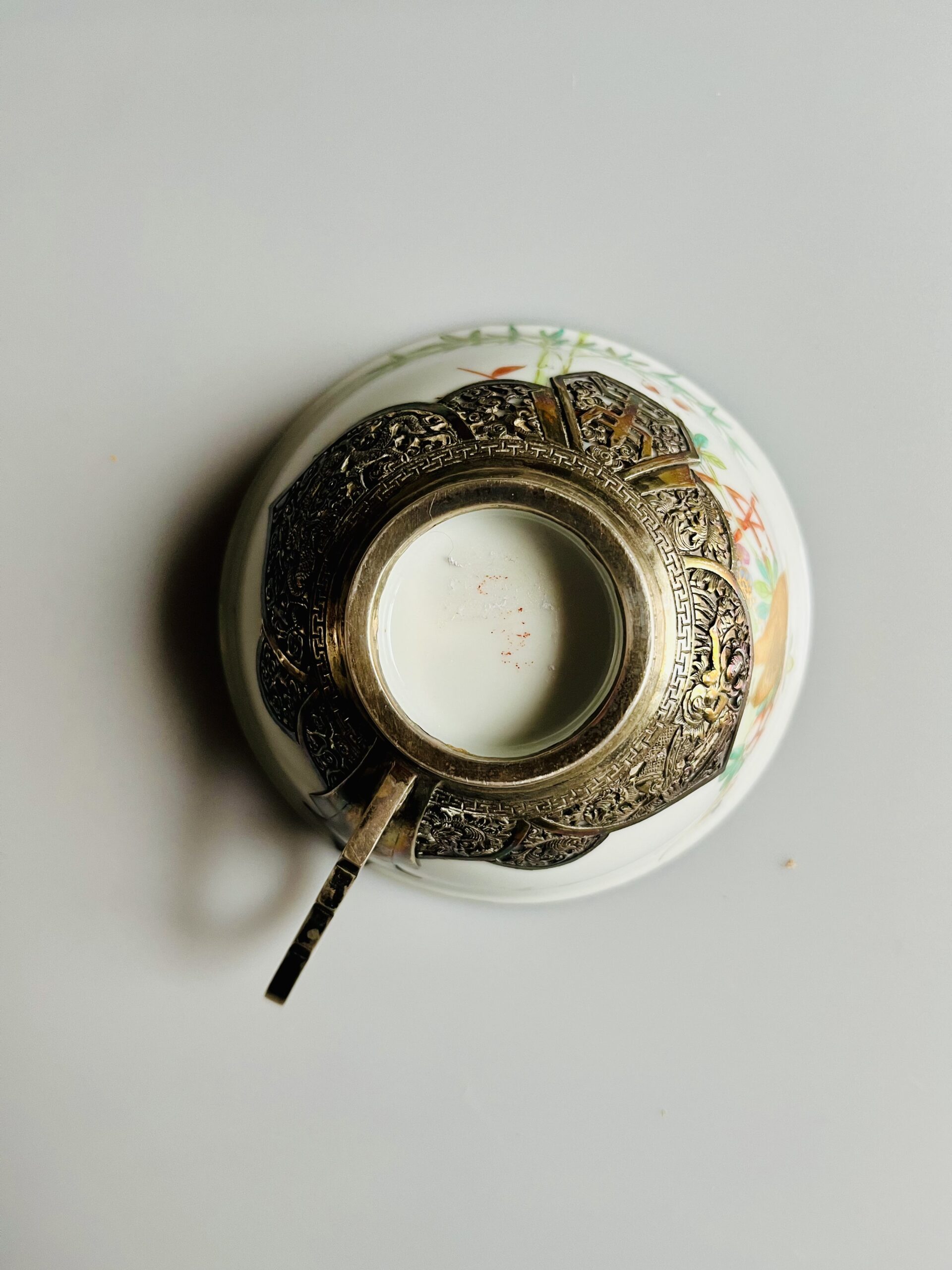 Taça para chá em porcelana chinesa decorada com ave e flores, produção para o mercado do Vietnã, com armação e pires em prata maciça de lei
