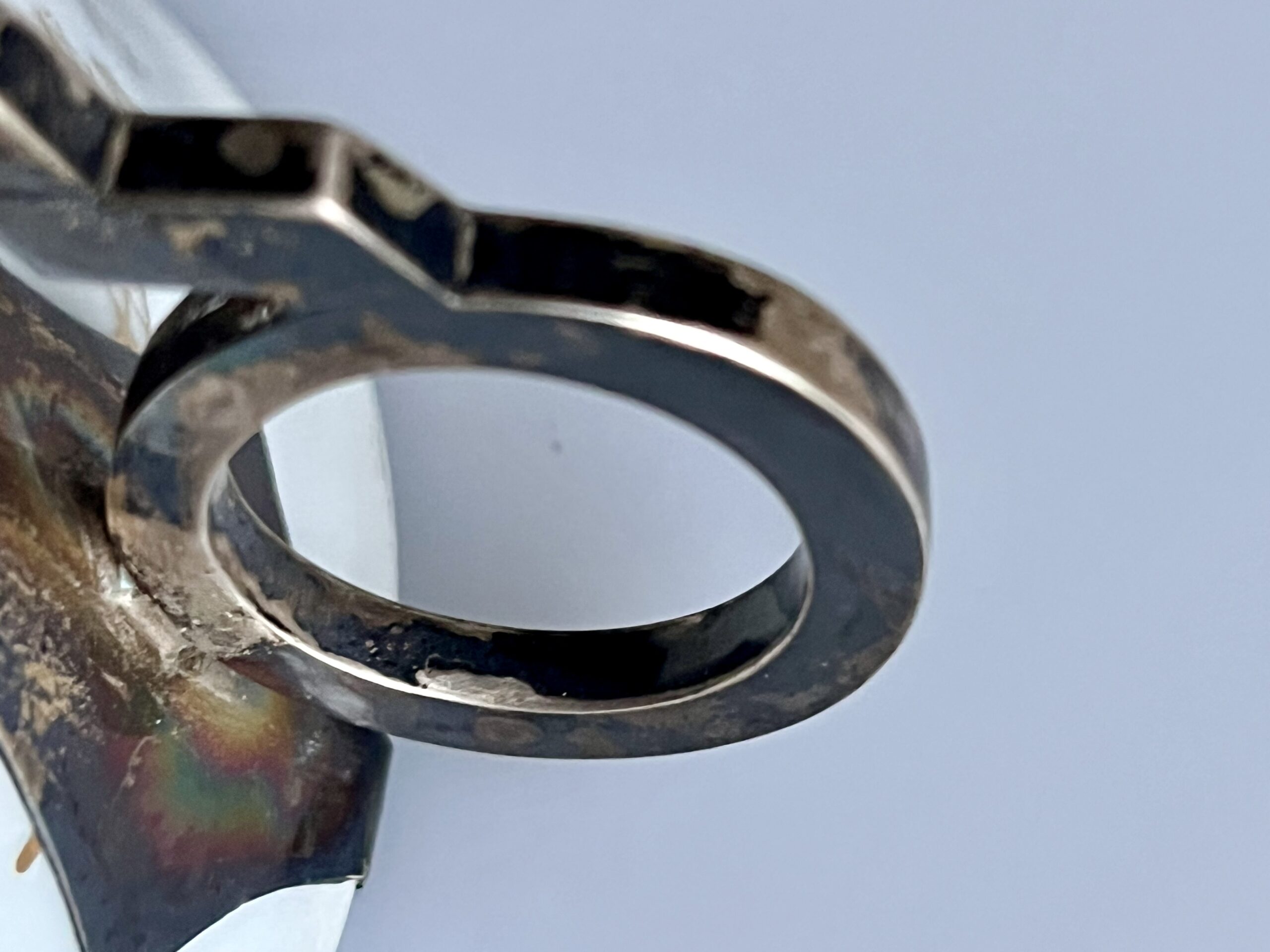 Em boas condições, sem rachaduras ou fios, ligeiros desgastes, marcas e sinais de uso e idade. Uma das pegas apresenta uma pequena lasca, conforme é possível ver na foto, de resto em boas condições