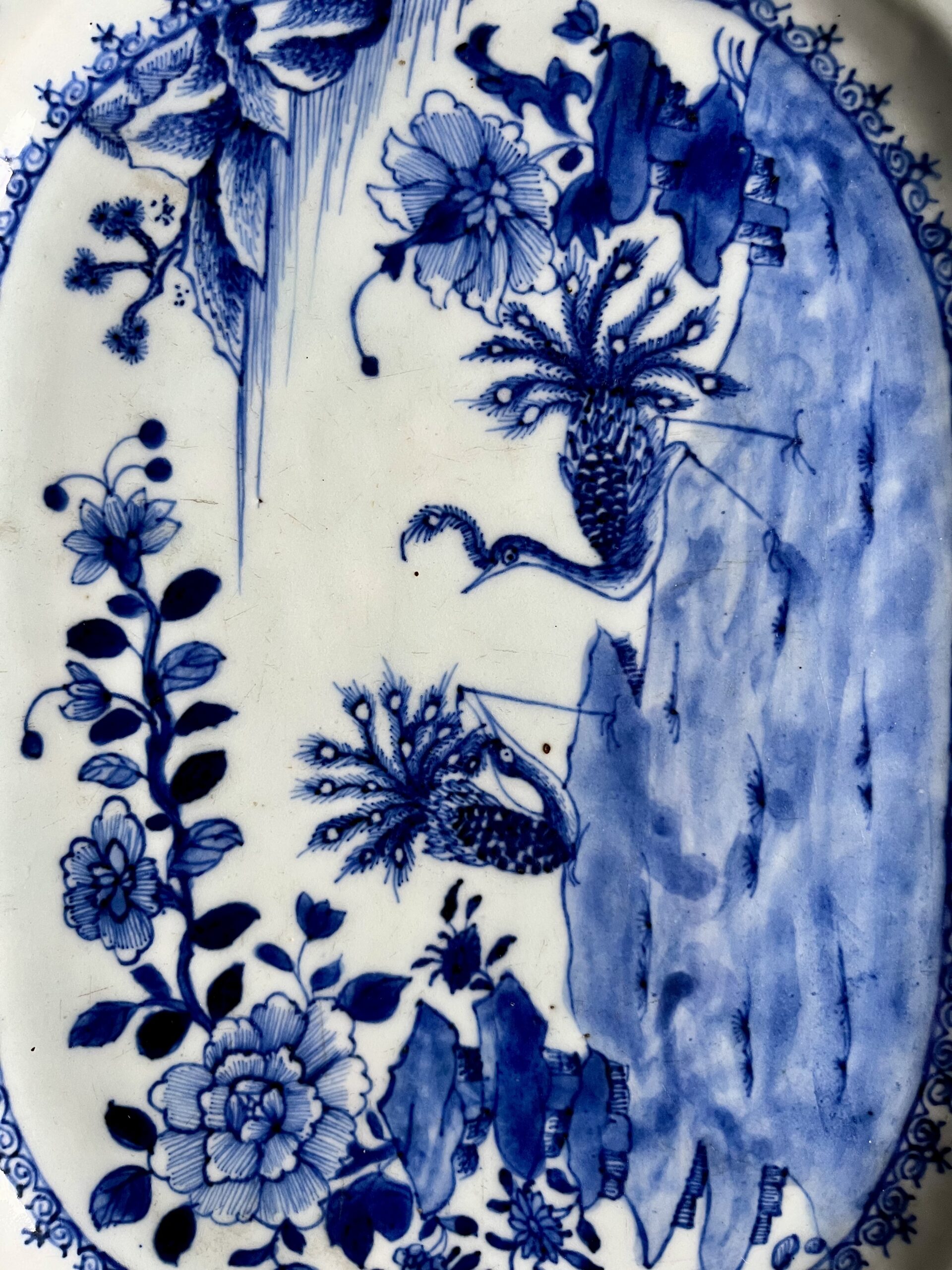 Travessa oitavada em porcelana Chinesa Companhia das Indias, reinado Qianlong (1735-1795), decoração azul e branco com paisagem floral e pavões num lago.