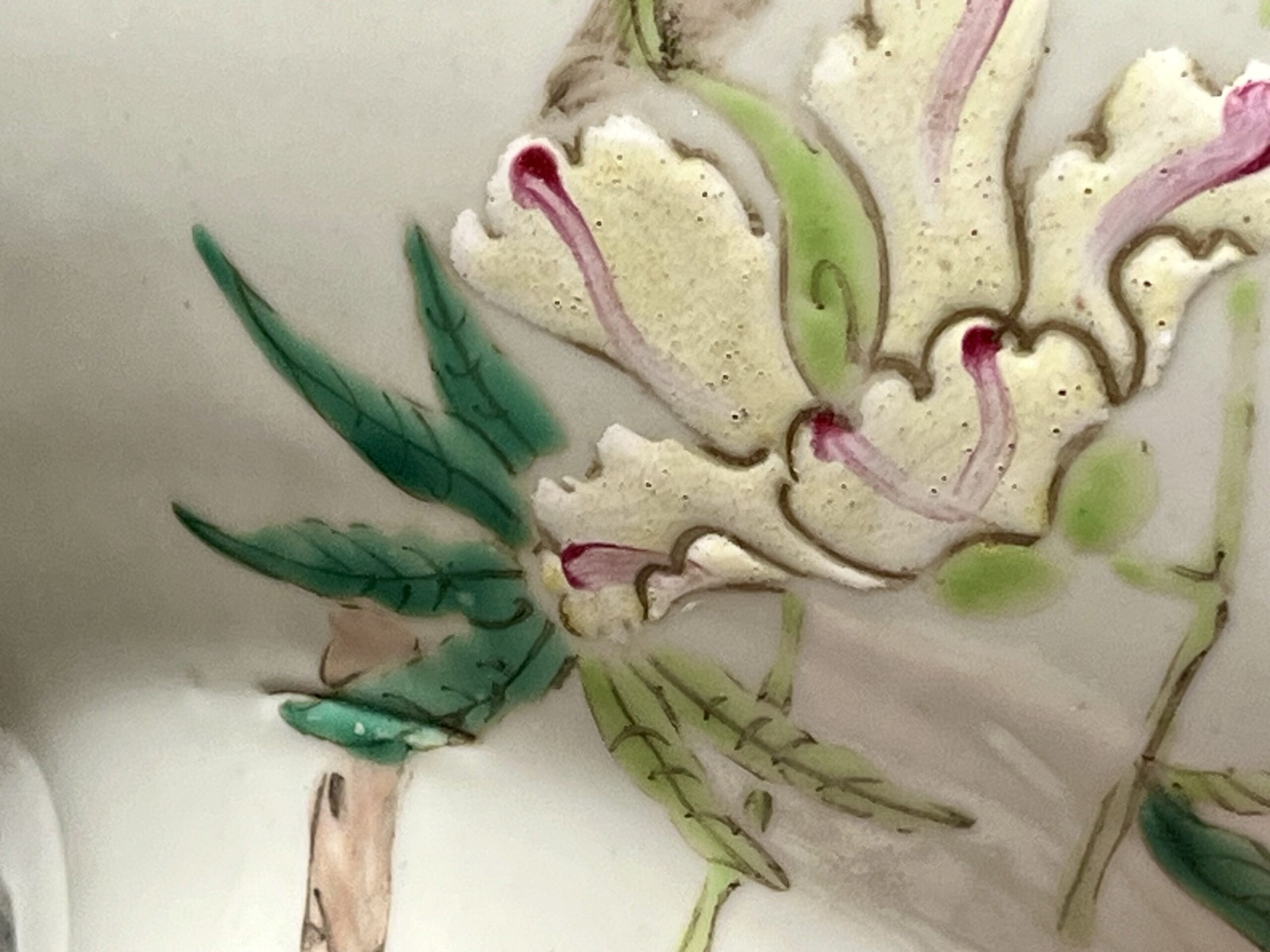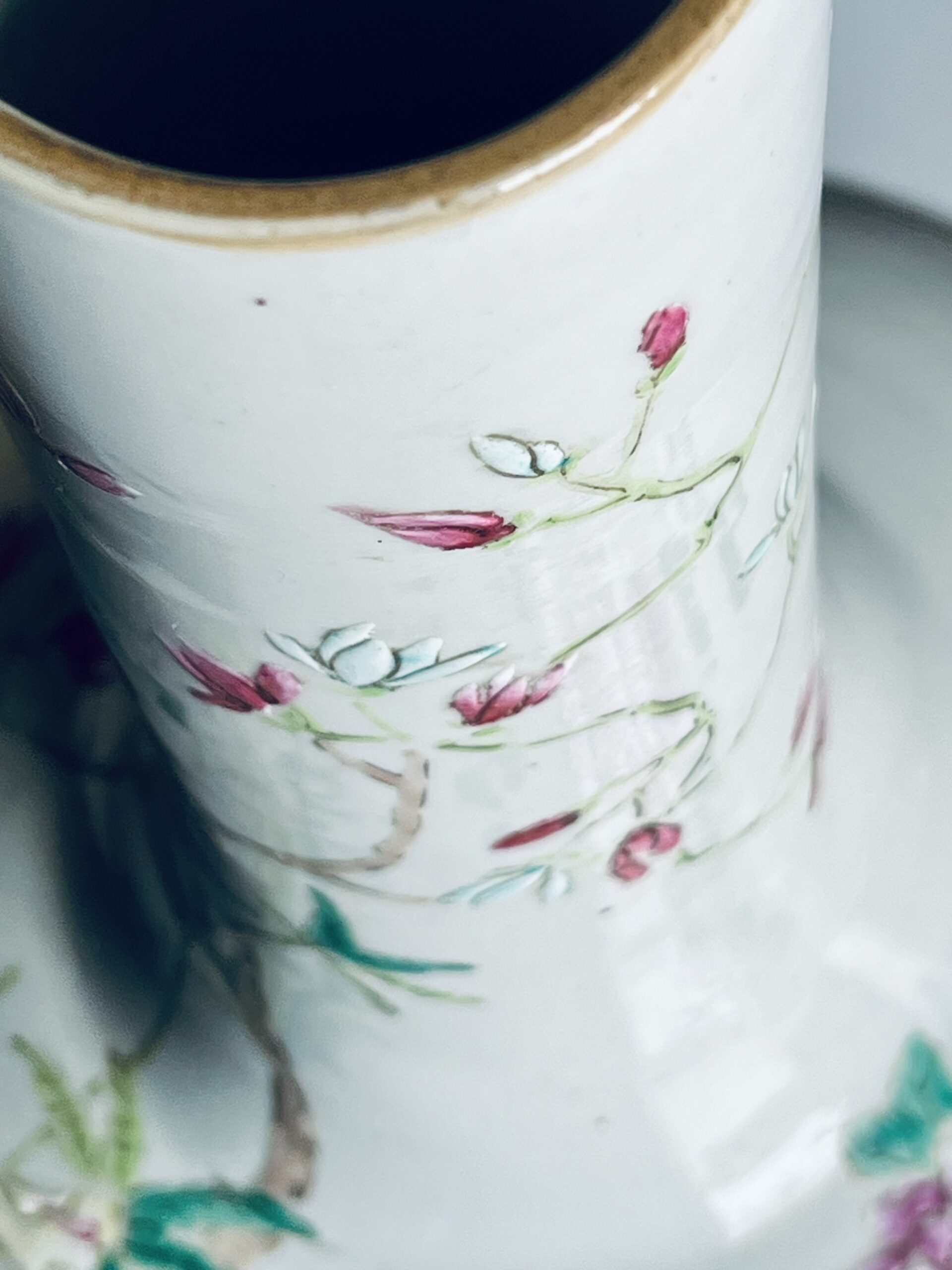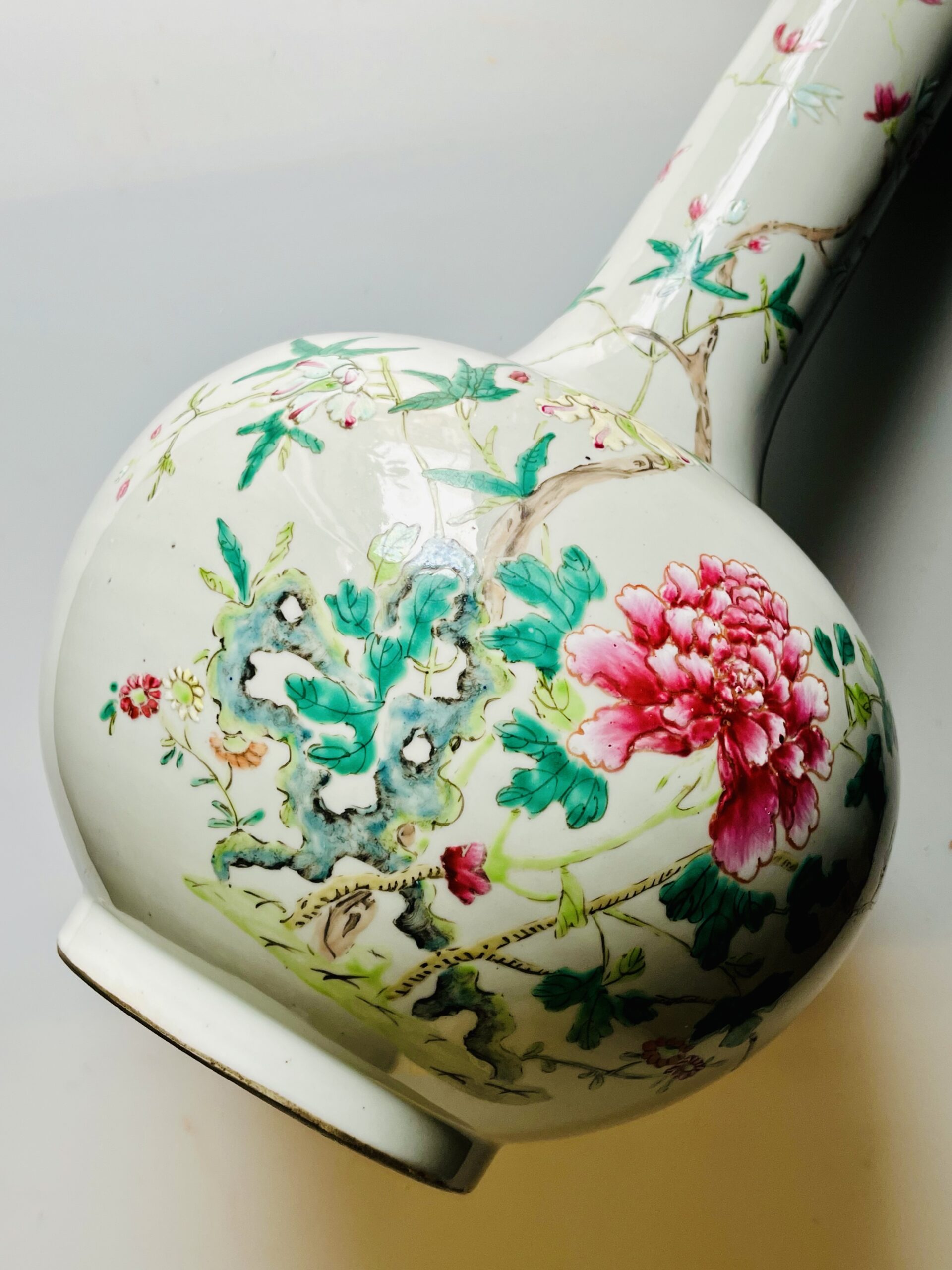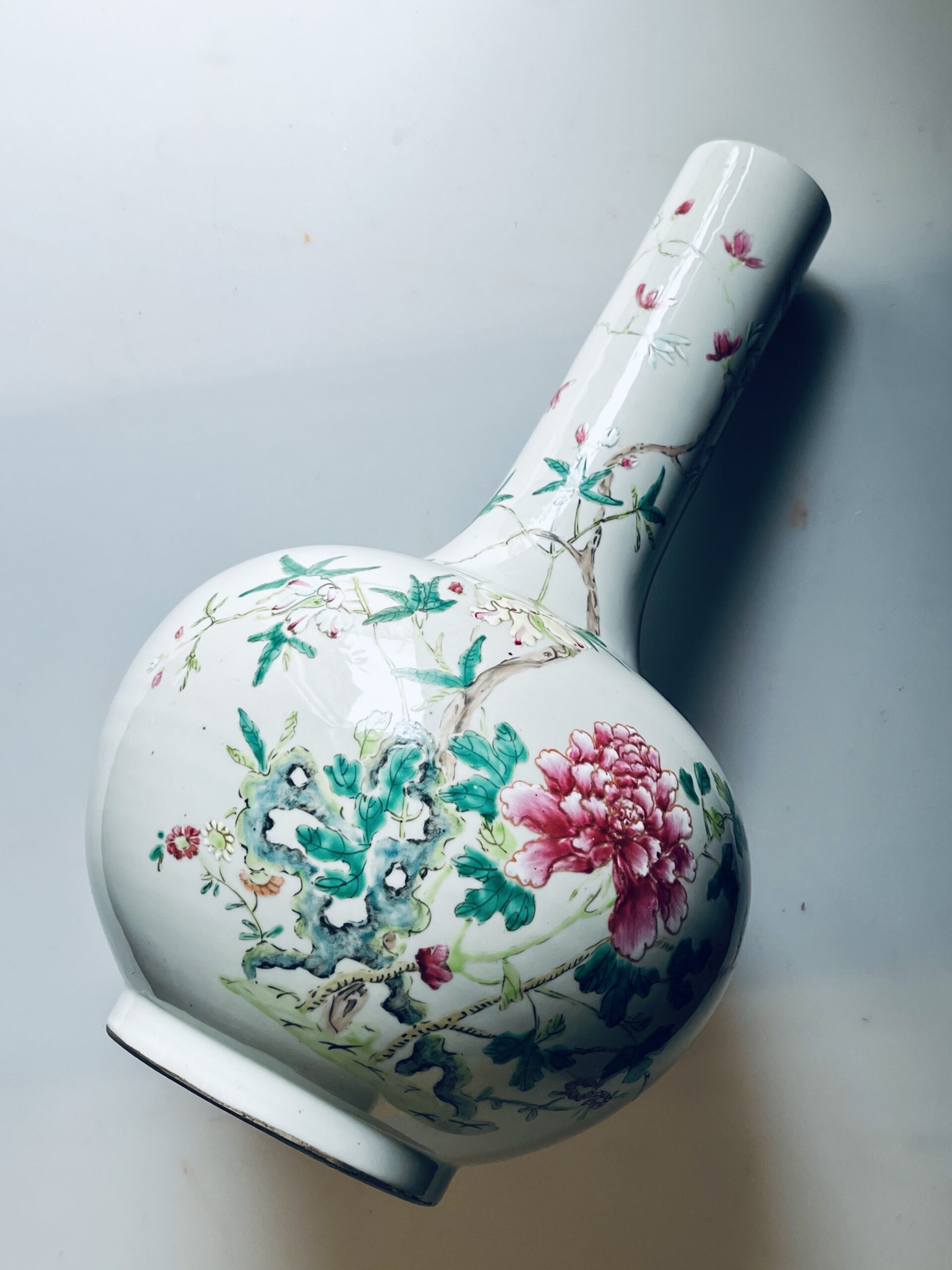 Vaso em forma de garrafa bojuda e gargalo alto, com pintura de peónias em tom rosa, ramos e morcegos, sinais e marcas de uso pela idade, de resto em muito boa condição de conservação.